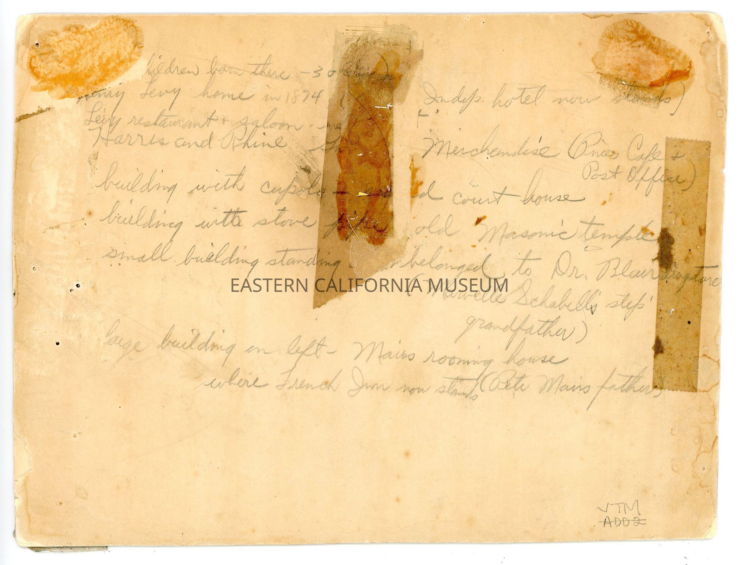 Handwritten in pencil on reverse: [Illegible] children born there [illegible]. Henry Levy home in 1874 [where?] Independence Hotel now stands. Levy Restaurant and Saloon [illegible]. Harris and Rhine General Merchandise (Pine's Café and Post Office). Building with cupola second courthouse. Building with stove pipe old Masonic Temple. Small building standing [illegible] belonged to Dr. Blair drugstore (Marvelle Schabbell's step grandfather). Large building on left Mairs rooming house where French Inn now stands (Pete Mairs' father).