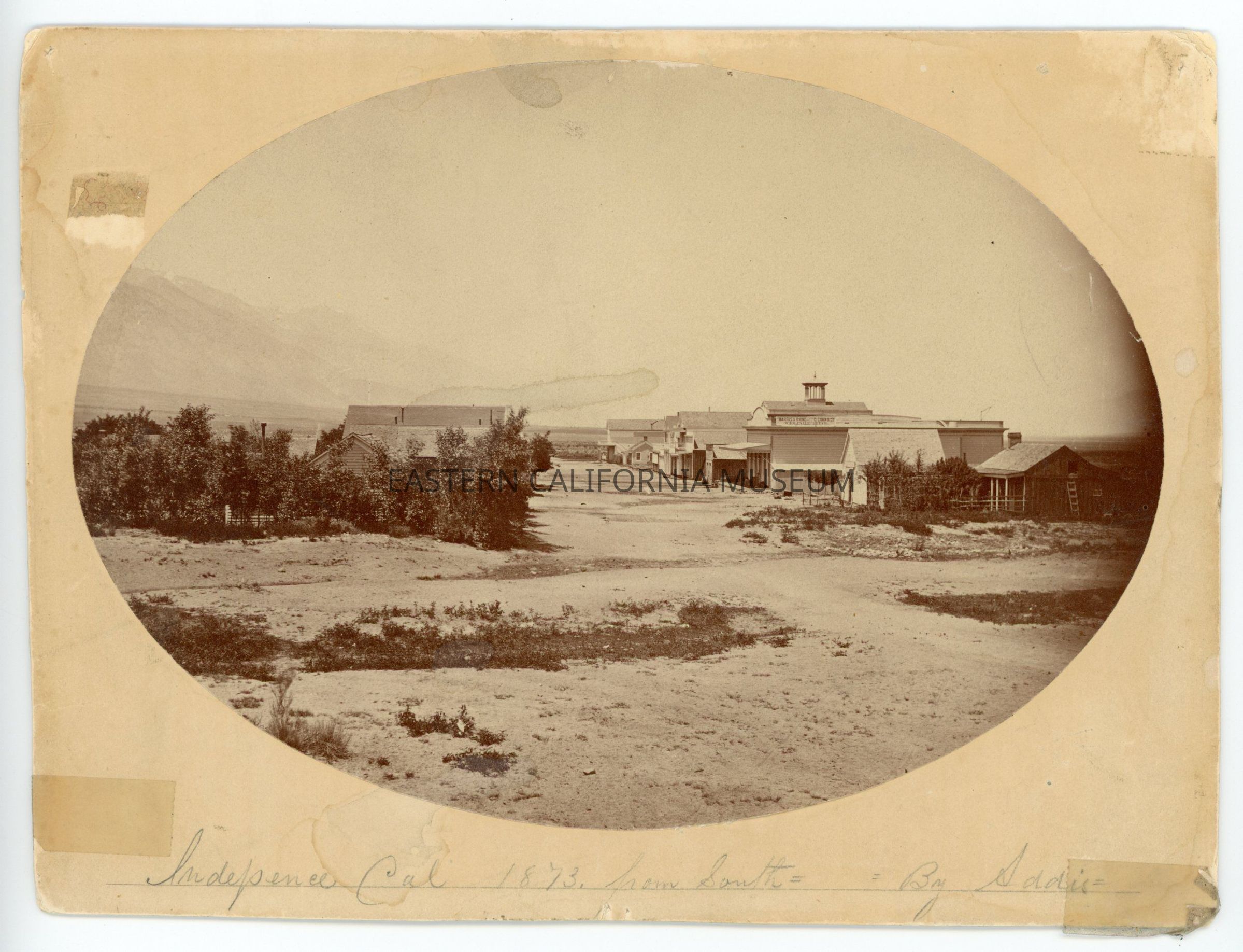 Mounted photo of the town of Independence captioned in pencil below: "Independence Cal. 1873 from South. By Addis."