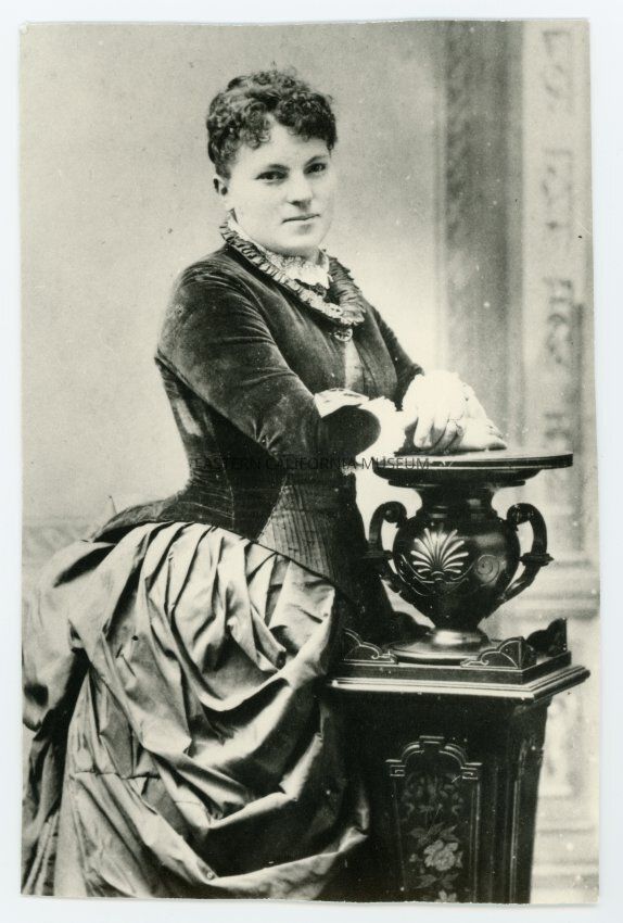 Copy of a nearly full-length studio portrait of Golda Rothschild Eibeshutz, who was married to Aaron W. Eibeshutz. They were Inyo County pioneers. The photo appears to have been taken circa the 1870s. Mrs. Eibeshutz is wearing a a beautiful dress while posing next to an urn on a pillar.