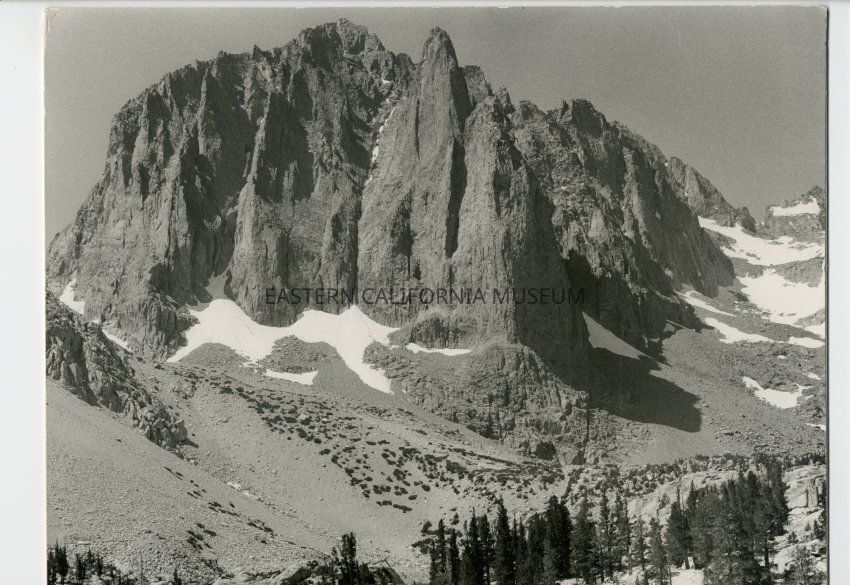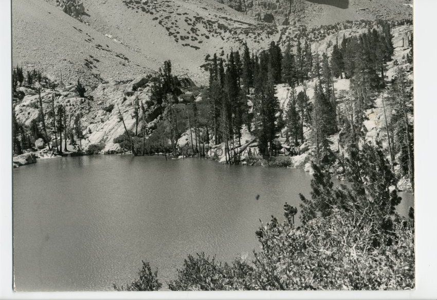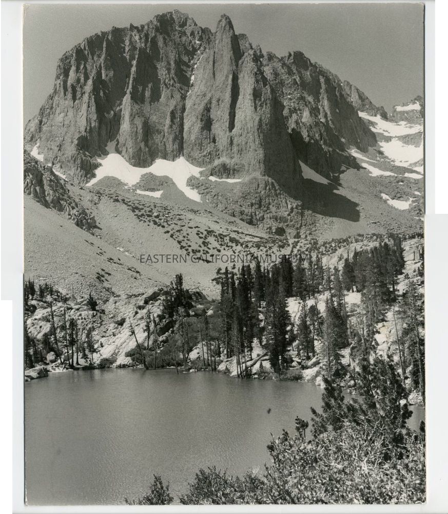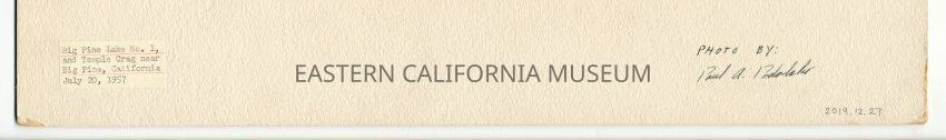 Label affixed to reverse says, "Big Pine Lake No. 1, and Temple Crag near Big Pine, California, July 20, 1957." Autographed on reverse is, "Photo by Paul A. [illegible, maybe Podalski?]."