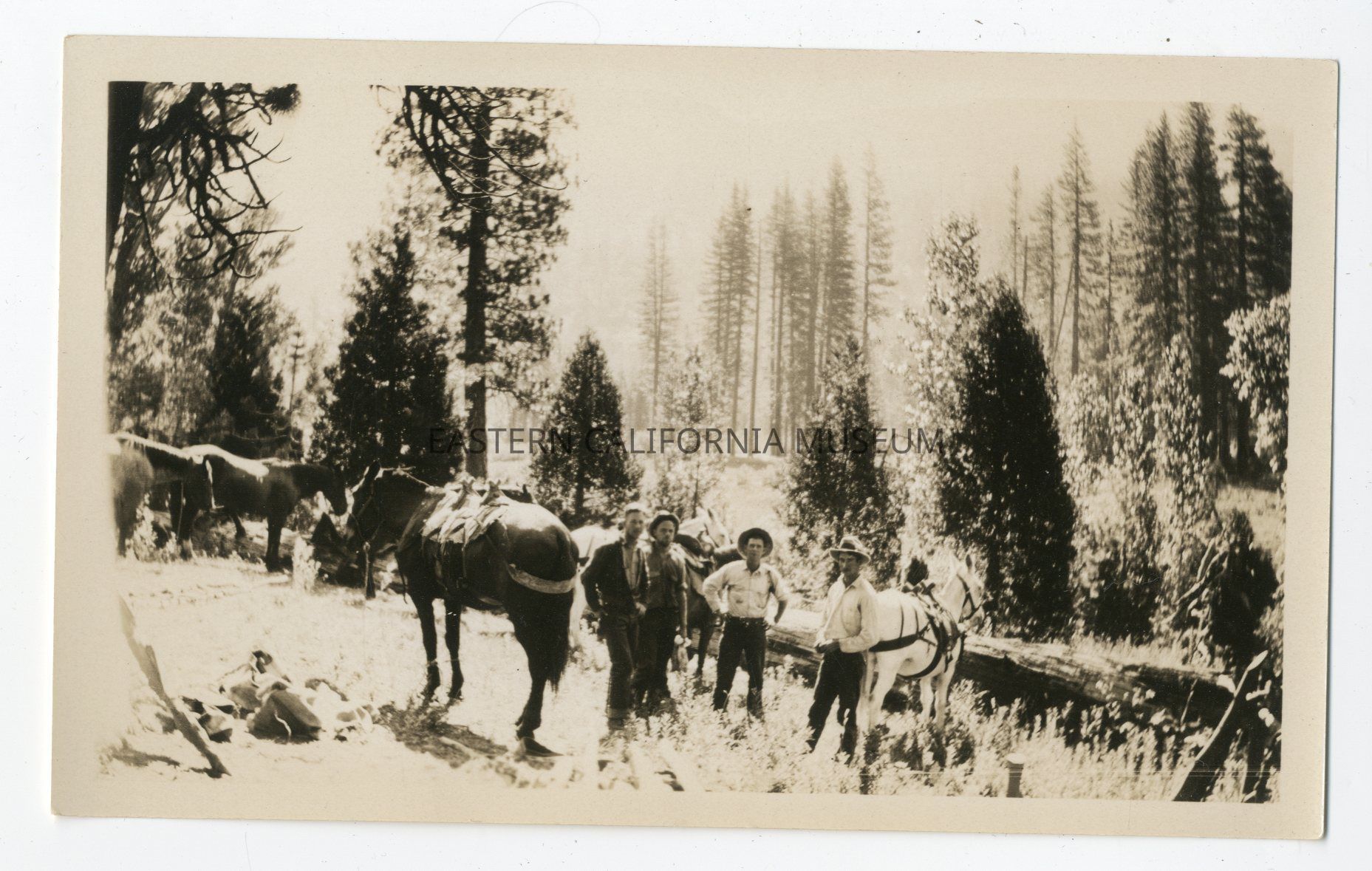 Photo of a group of four men standing with their saddled horses around them. They are up in the mountains, but the location is unknown.
