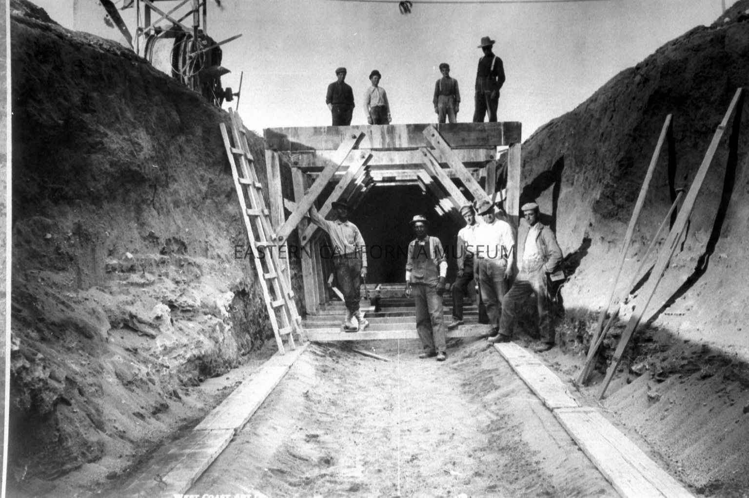 B & W digital scan of LADWP Carpenters standing next to a framed portion of Covered Conduit section of LA Aqueduct.
