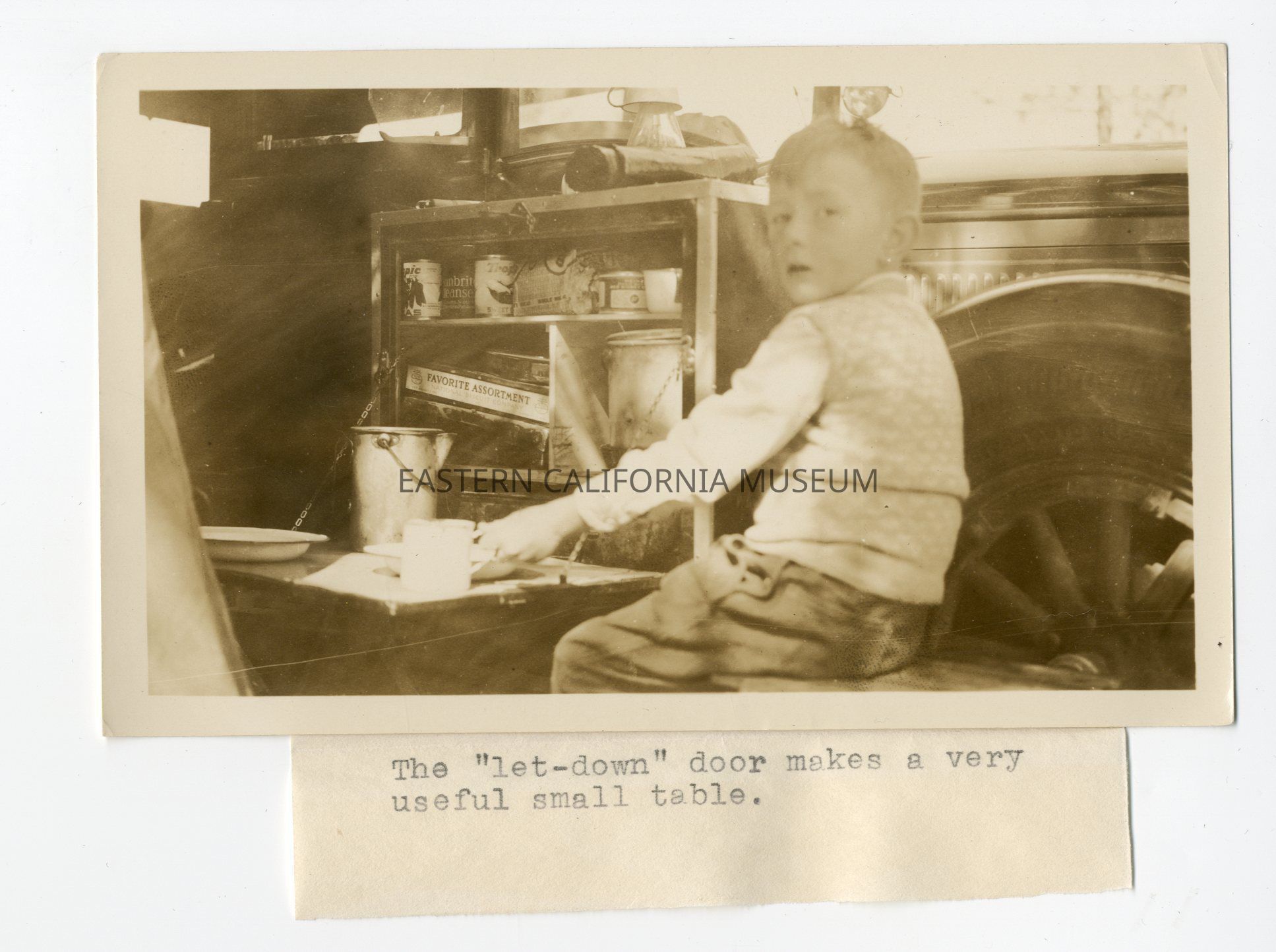Photo of a young boy (Peter Kreider?) sitting beside the automobile cupboard. Label beneath says, "The 'let-down' door makes a very useful small table."
