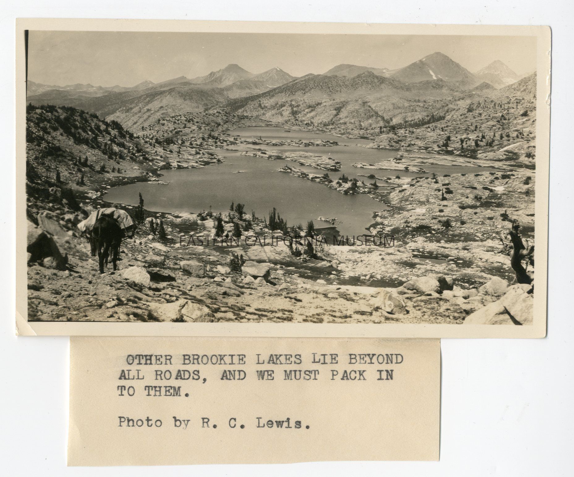 Photo of a mountain landscape with some pack animals in the left foreground. Label beneath says, "Other brookie lakes lie beyond all roads, and we must pack in to them. Photo by R. C. Lewis."