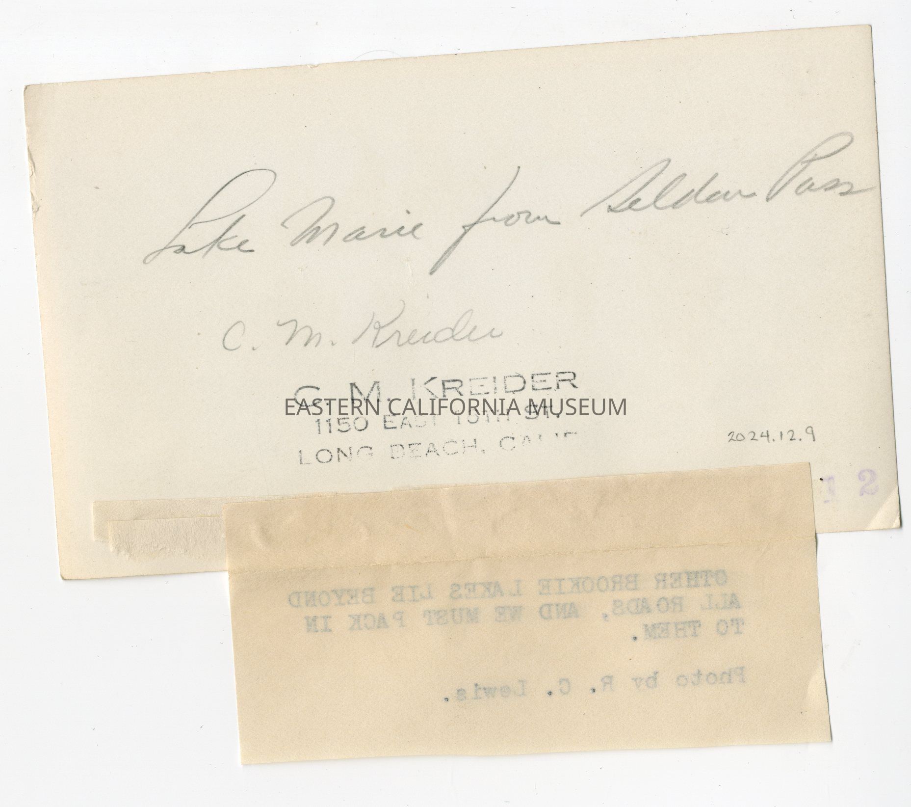 Stamped in black on reverse with C. M. Krider's Long Beach, CA address.Collection