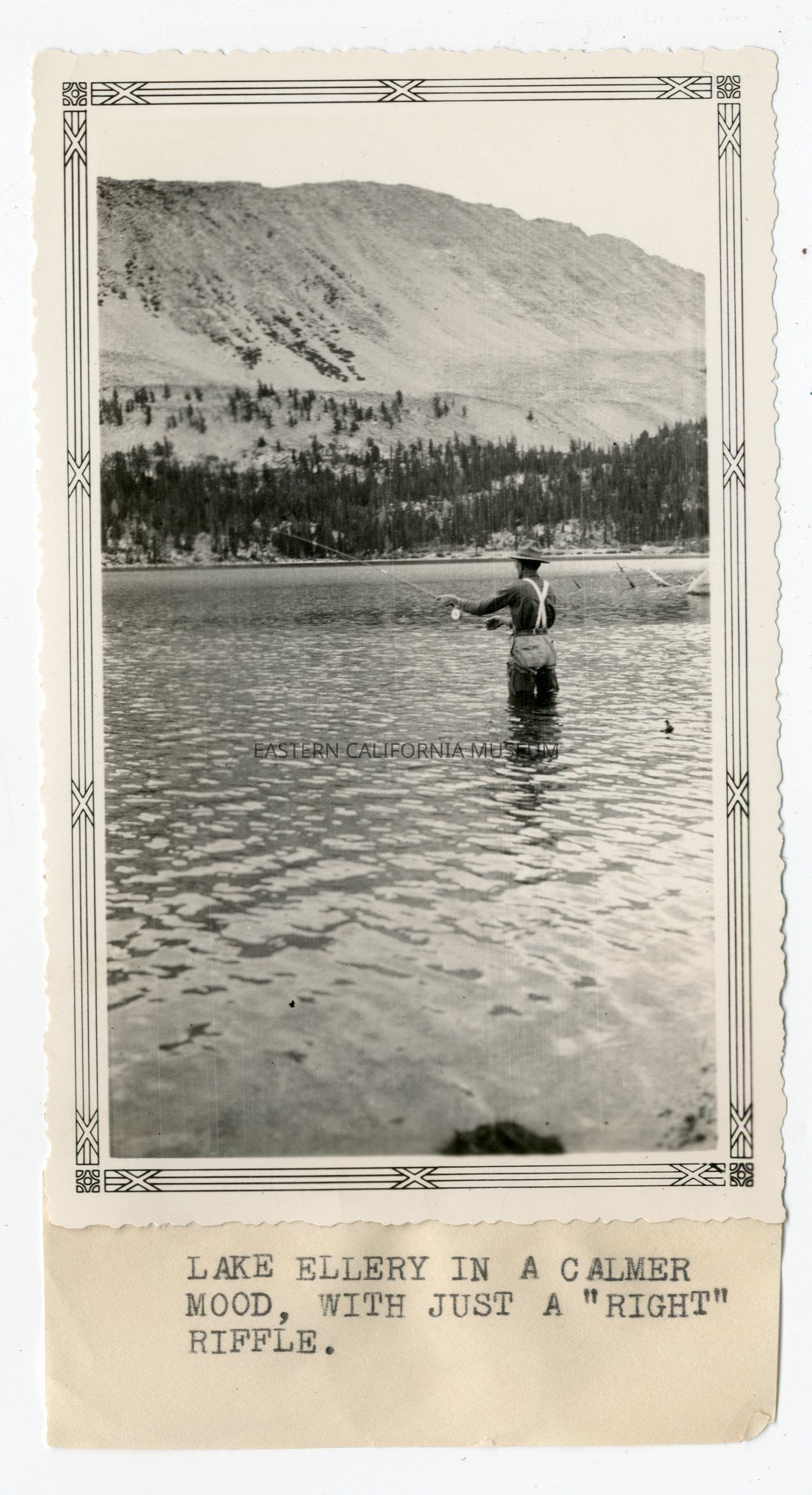 Photo of a man wearing waders and fishing in a lake. He is in to about mid-thigh depth. Label beneath says, "Lake Ellery in a calmer mood, with just a 'right' riffle."Collection