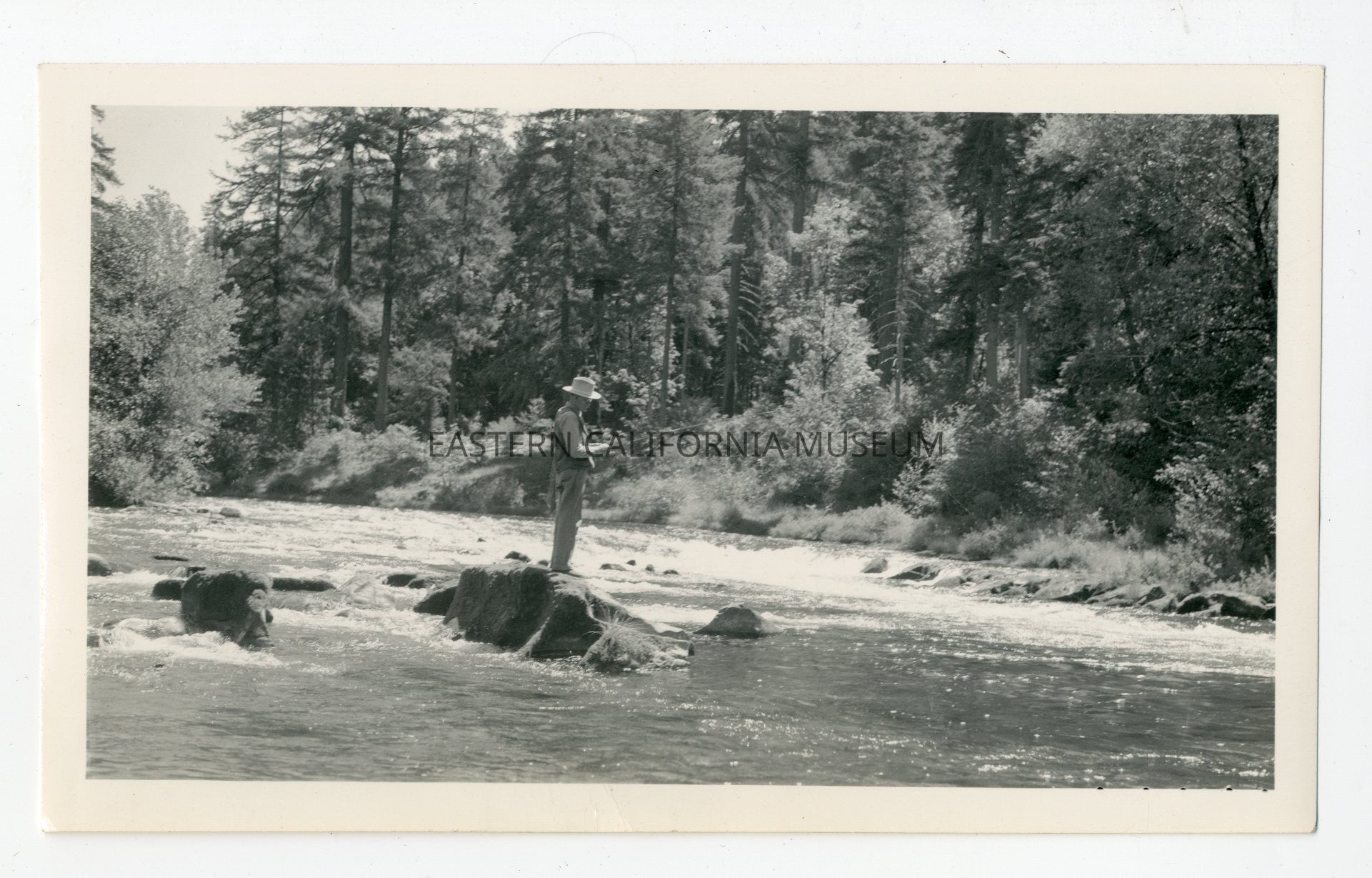 Photo of a man standing on a rock in the middle of a river fishing. Stamped on reverse with Geo. Winstead Photo [illegible], August 12, 1940."