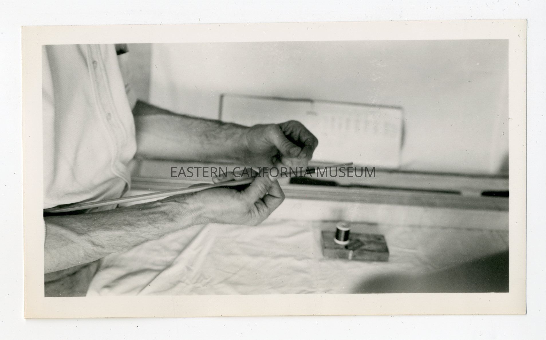 Close-up photo of a man's hands as he works on a fishing rod.