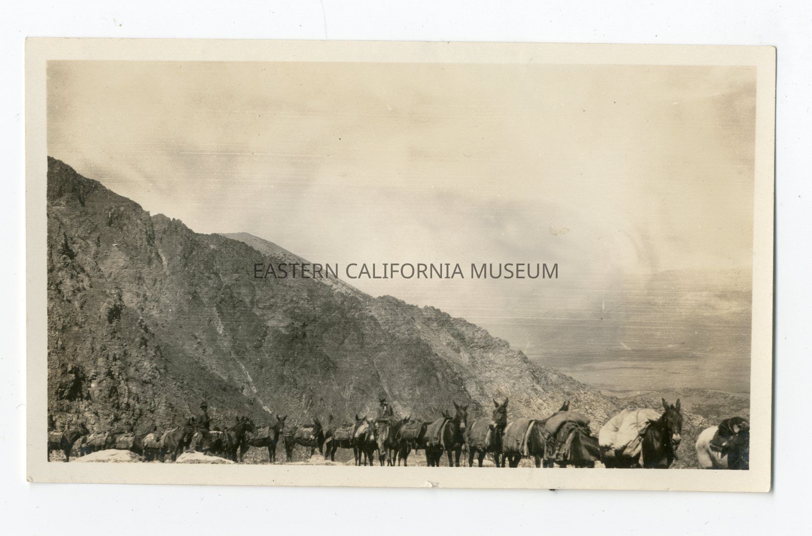Photo of a pack train high up in the mountains with a valley in the distance. Written in pencil on reverse: In Parker Pass.