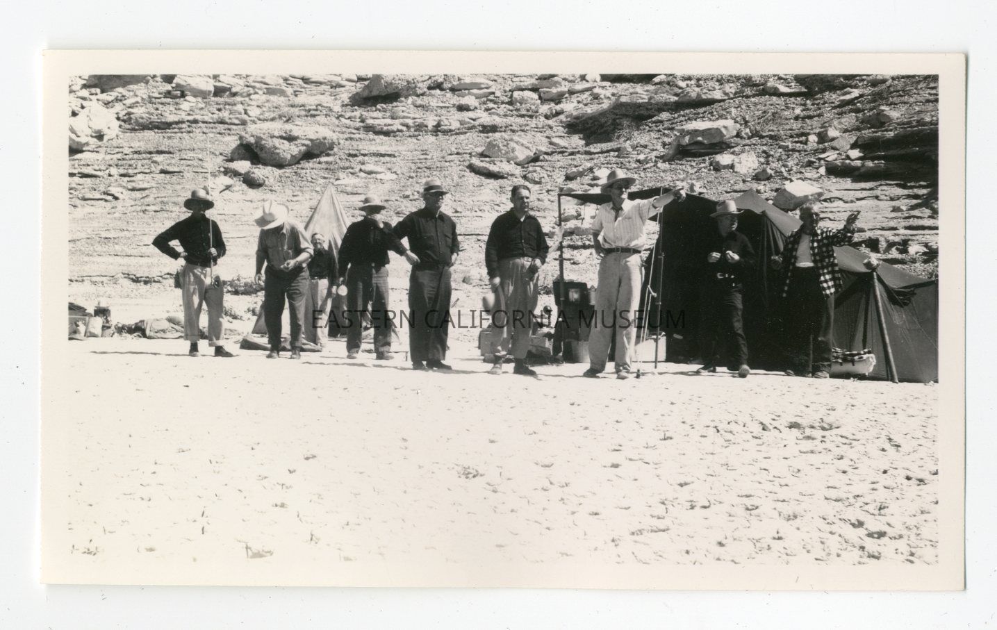 Photo of nine men standing in front of some tents and campsite. Two of them are point towards something off to the right.