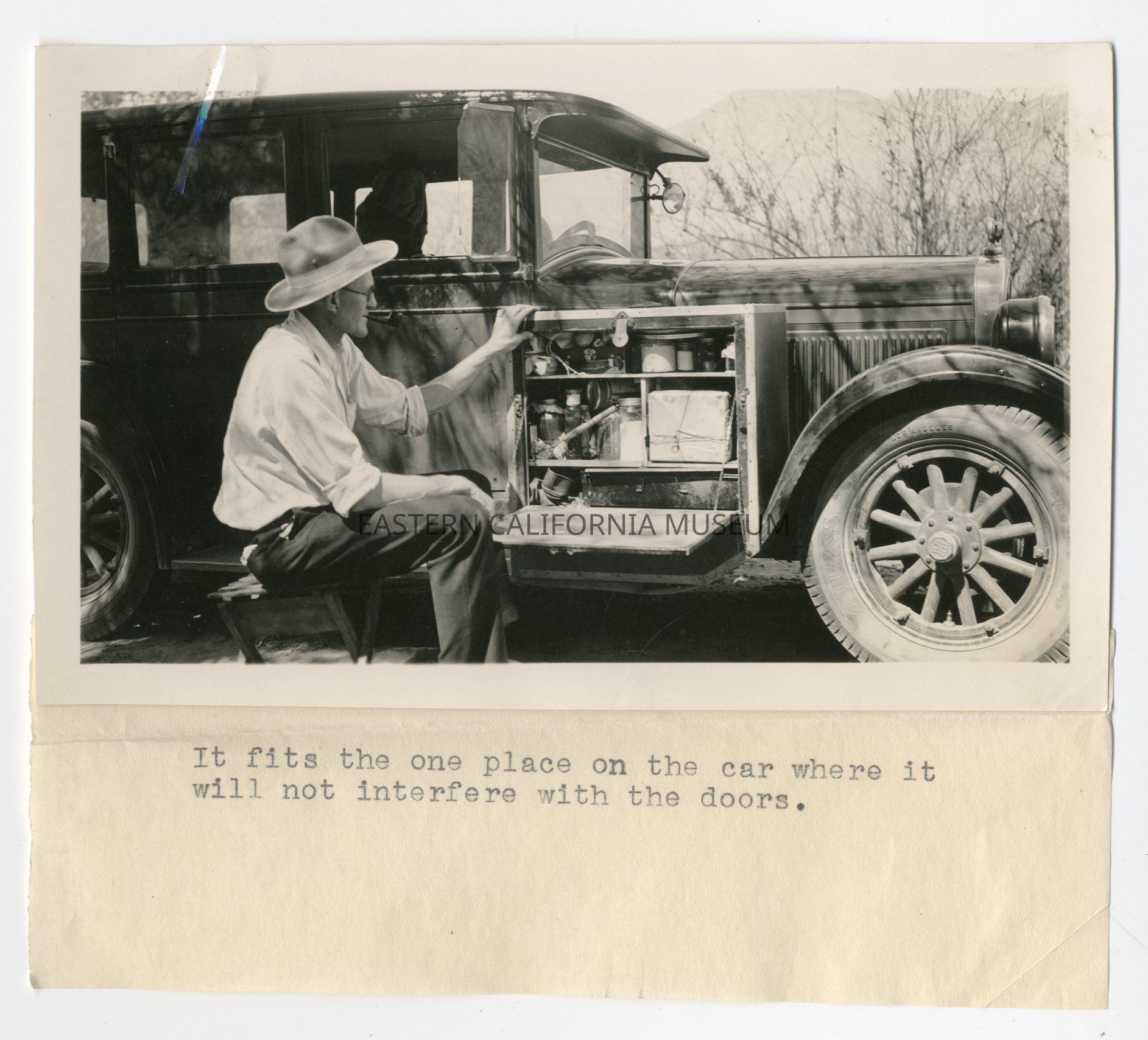 Photo of a man (Claude Kreider?) sitting on a stool by an early automobile. Label beneath says, "It [the automobile cupboard] fits the one place on the car where it will not interfere with the doors."Collection