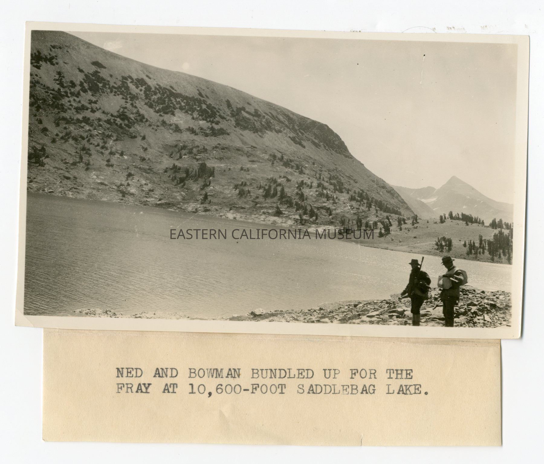 Photo of two people standing along the shore of a lake. Label beneath says, "Ned and Bowman bundled up for the fray at 10,600-foot Saddlebag Lake.
