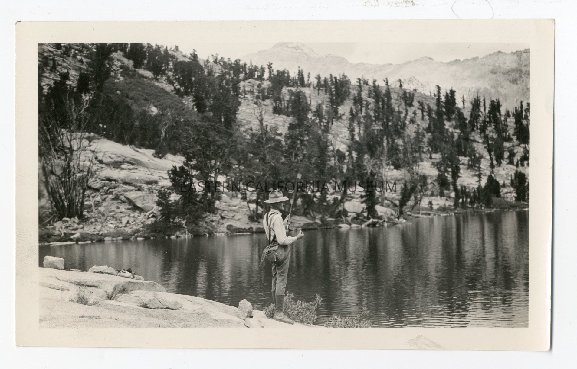 Photo of a man standing on a large boulder by the side of a lake fishing.