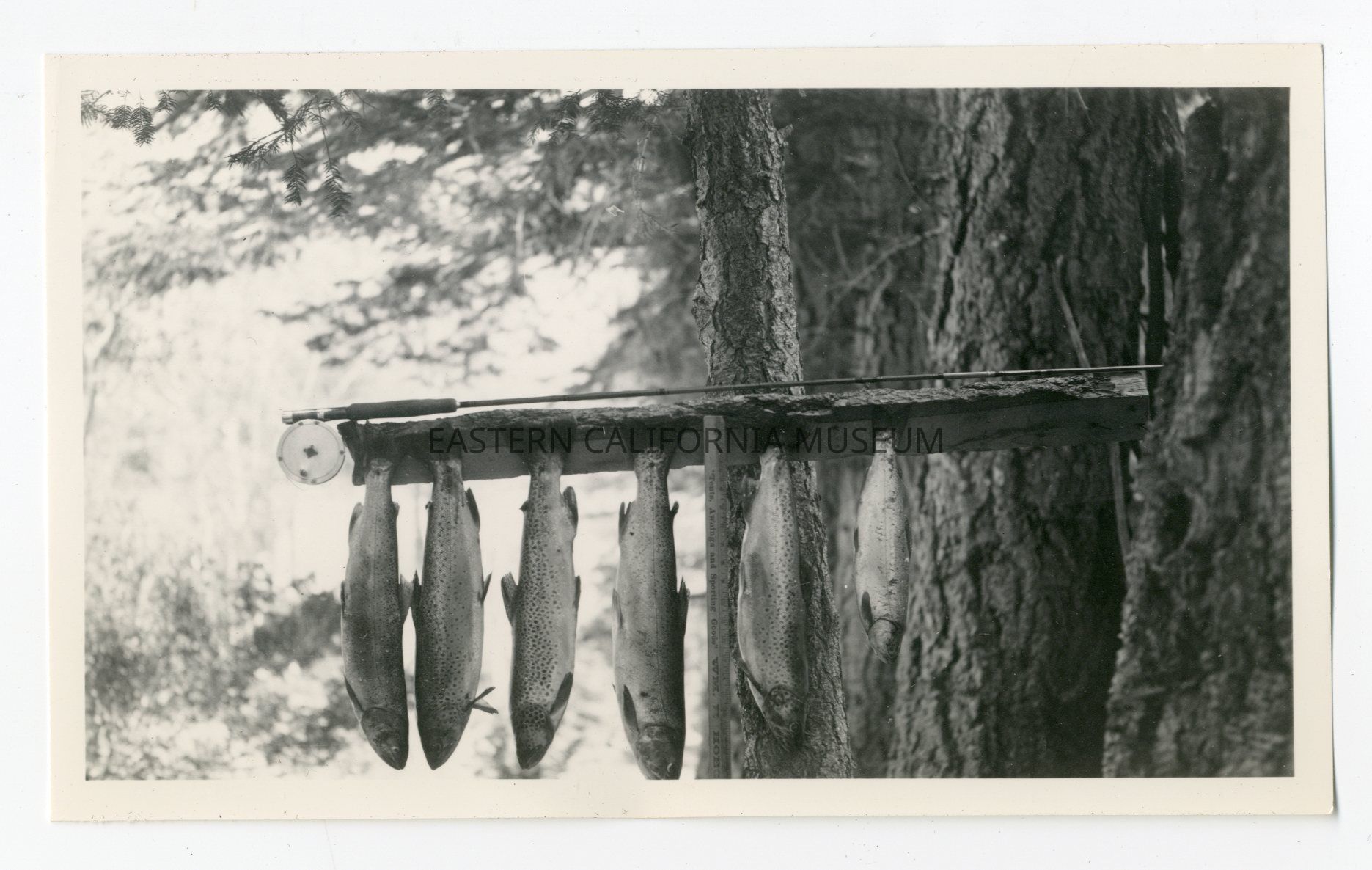Photo of six caught trout hanging from their tails on a log that has been affixed to a tree. There is a fishing reel resting on top of the log.