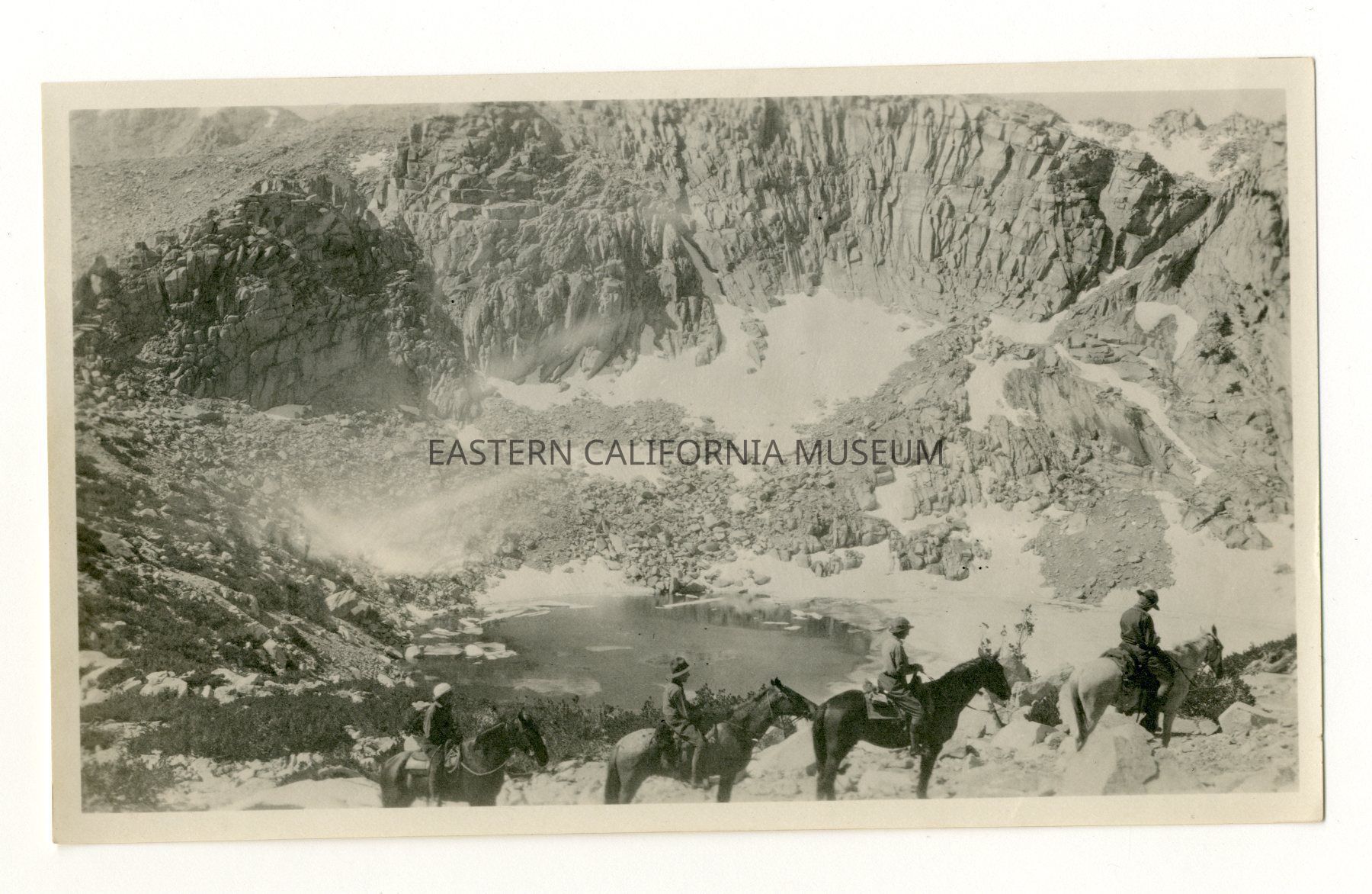 Photo of four people on horseback on a steep mountainside with a lake at the bottom. There is a lot of snow in the basin.