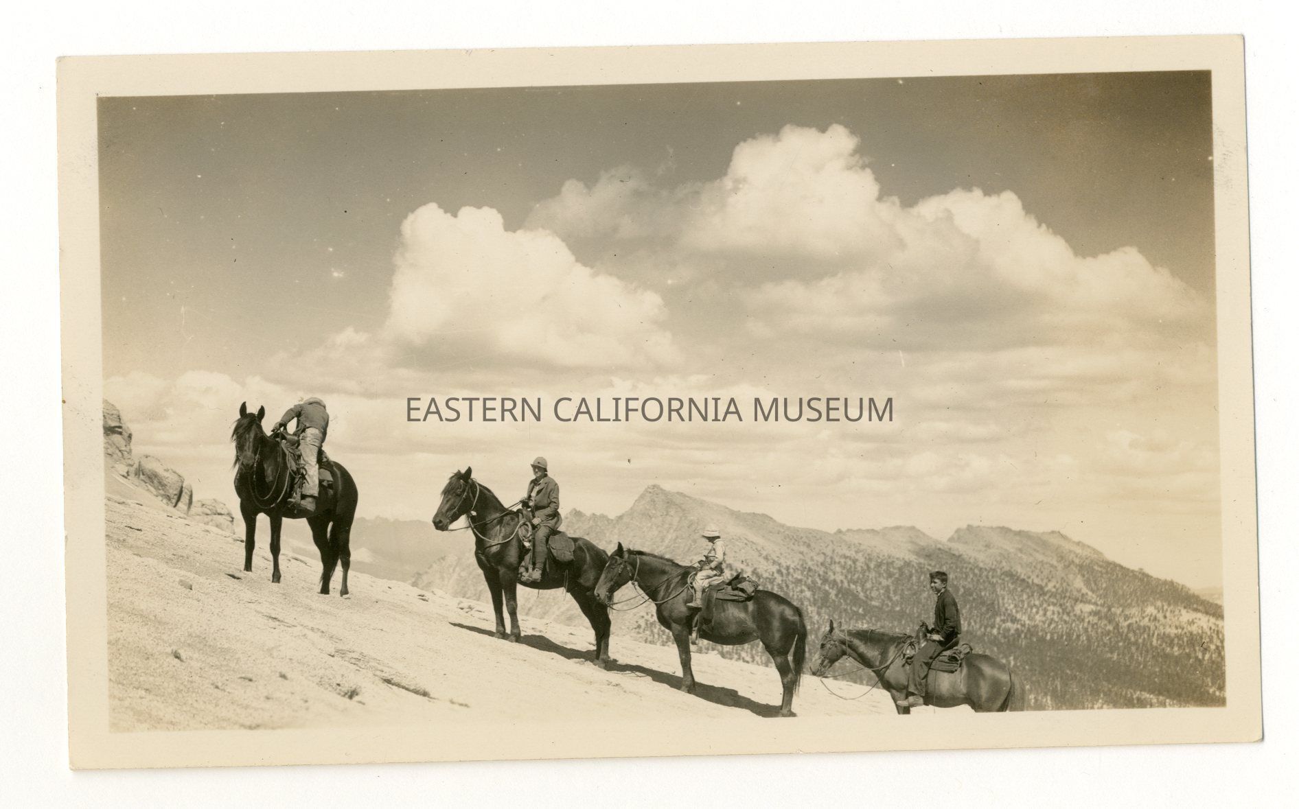 Photo of four people on horseback going up a mountainside. There are mountains in the far distance.