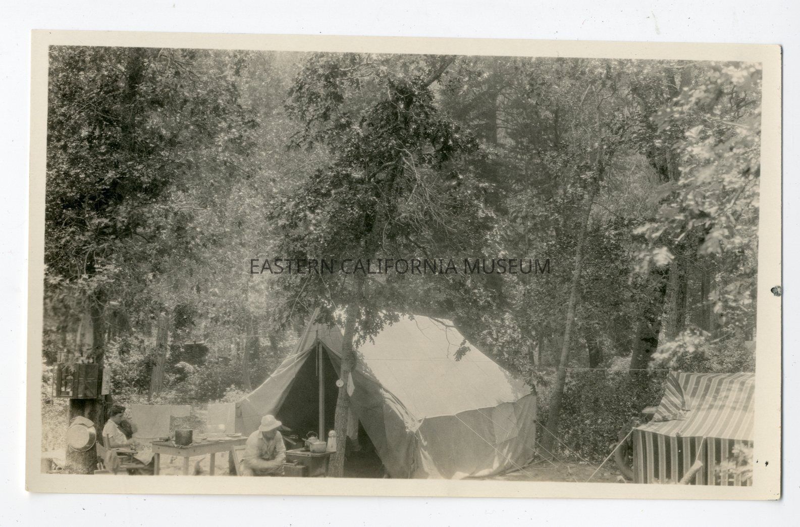 Photo of two tents (one is striped fabric), table, and two people relaxing at their campsite.