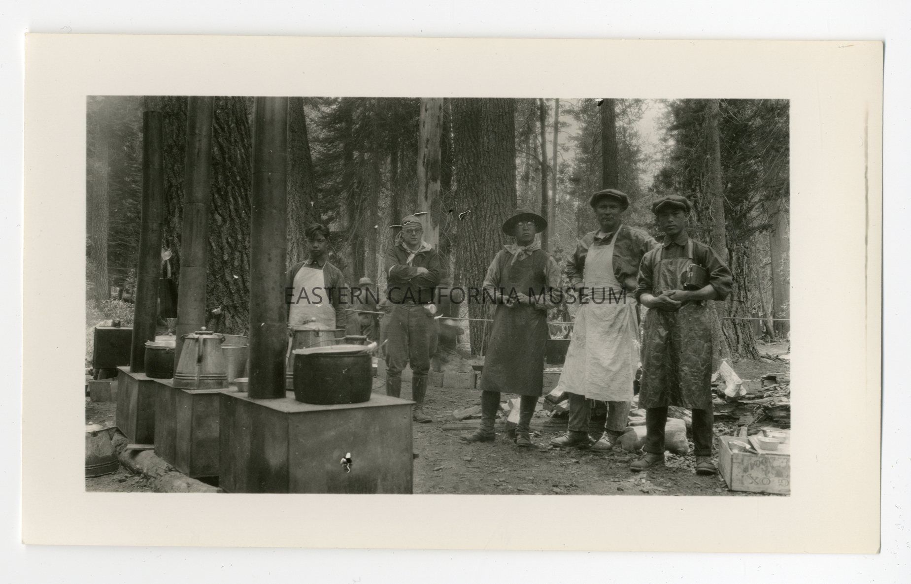 Photo of five men, four of which are wearing aprons, standing in front of three metal stoves at a campsite. There are more people in the background. Maybe they are the cooks/chefs for a Sierra Club Trip?Collection