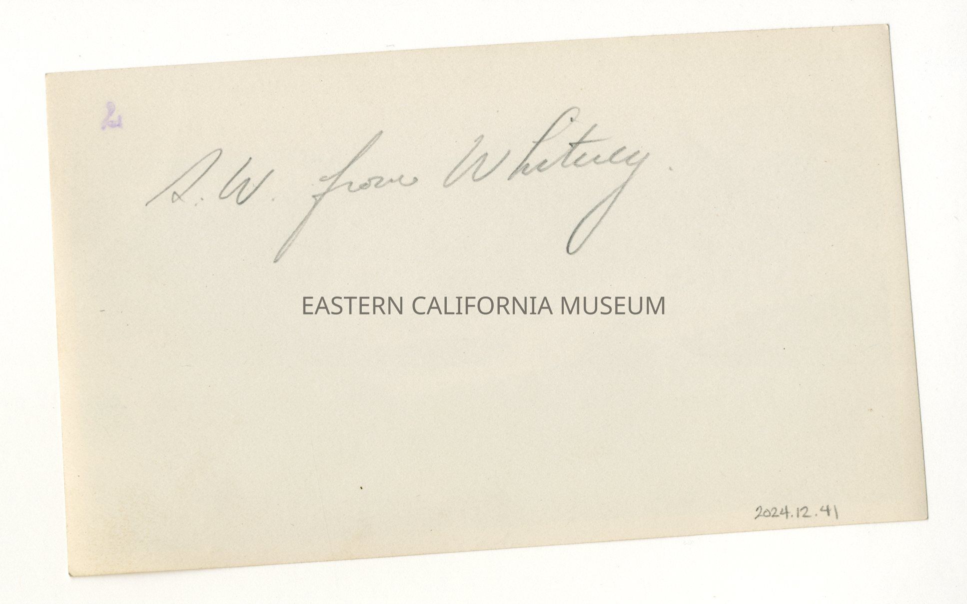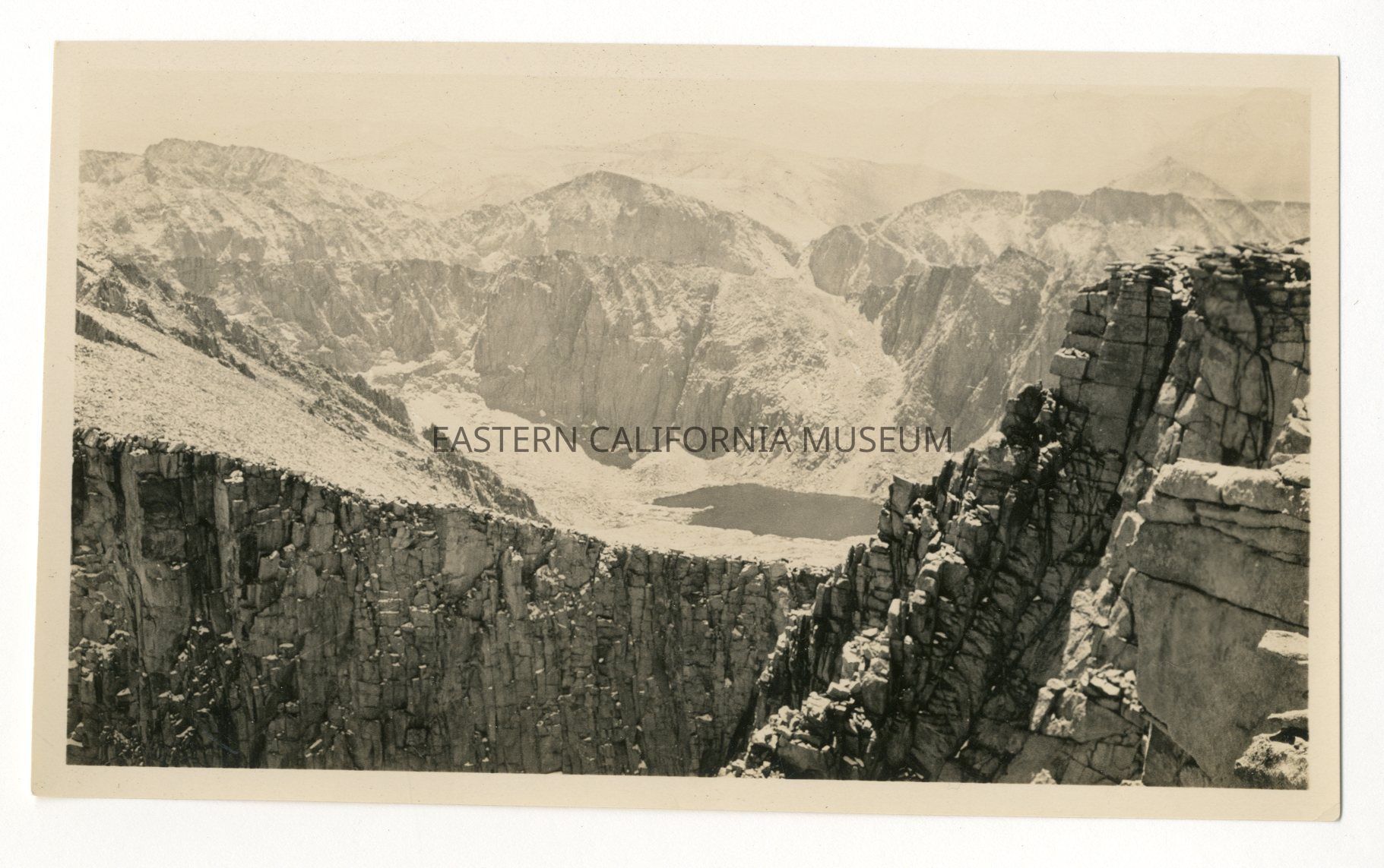 Photo of a rocky mountain landscape. There is a lake in the center distance. Written in pencil on reverse: S.W. from Whitney.