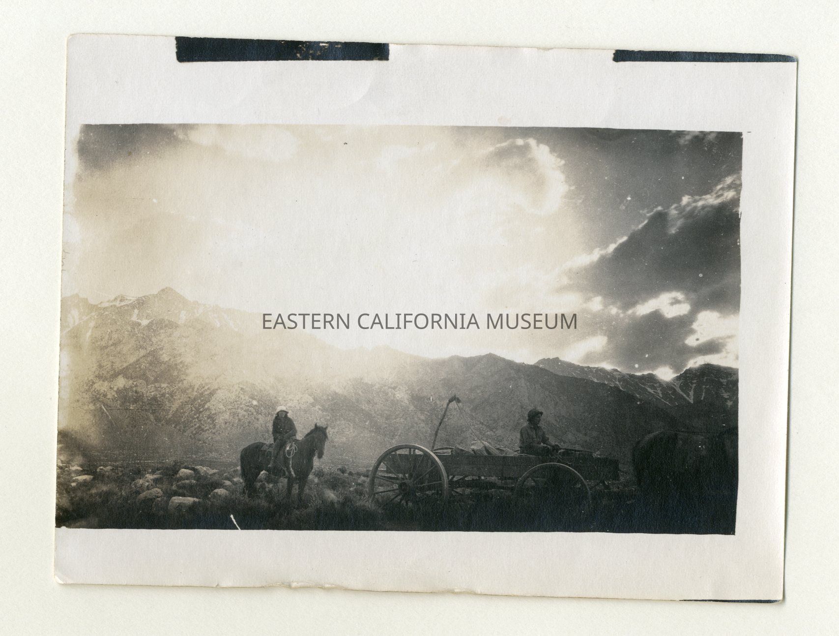 Photo of a horse-drawn wagon with a person in it. There is a second person on horseback behind the wagon. The Sierra Nevada mountain range is in the background. The location may be the Manzanar area.Collection