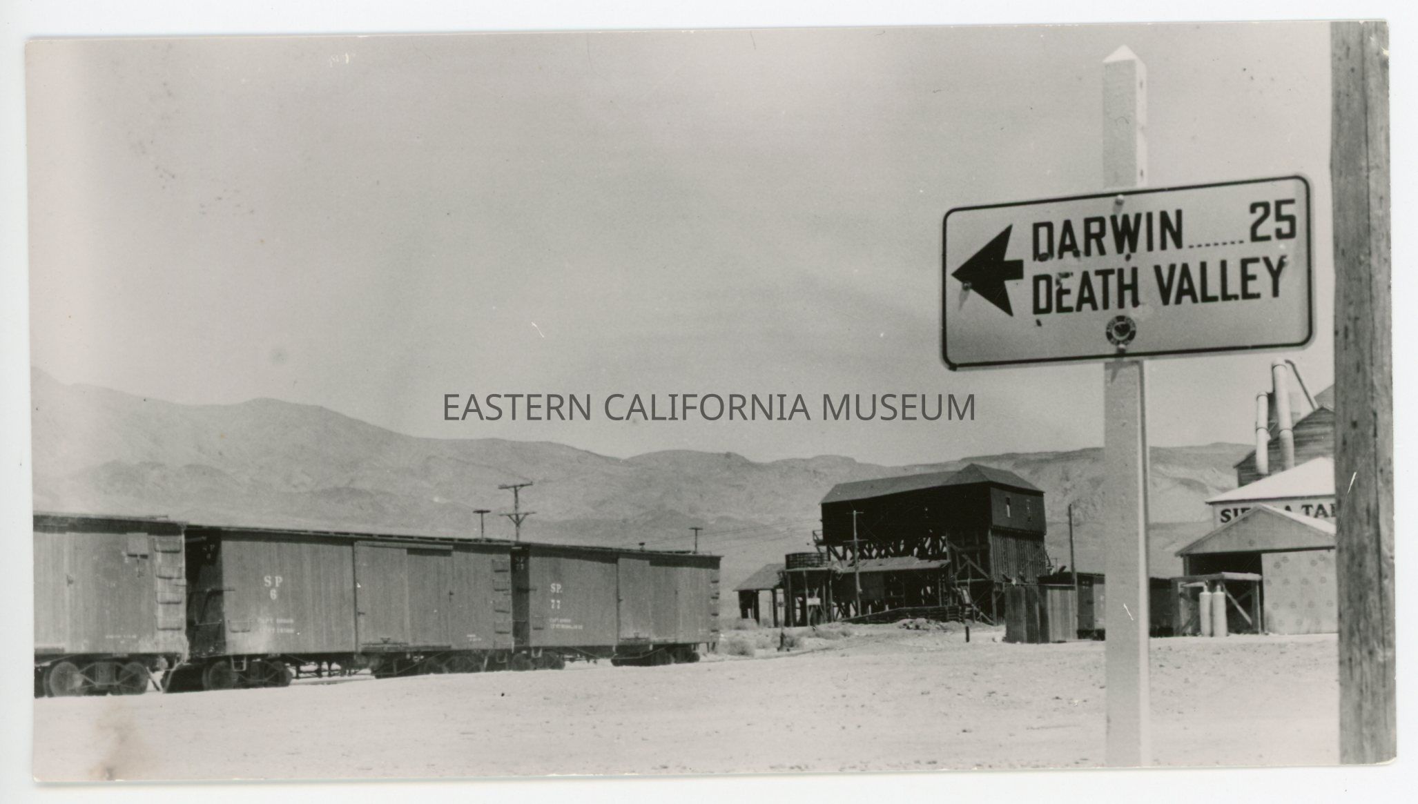 Photo of Southern Pacific box cars at the Sierra Talc plant in Keeler. There is a road sign in the foreground that says, "Darwin 25 / Death Valley."Collection