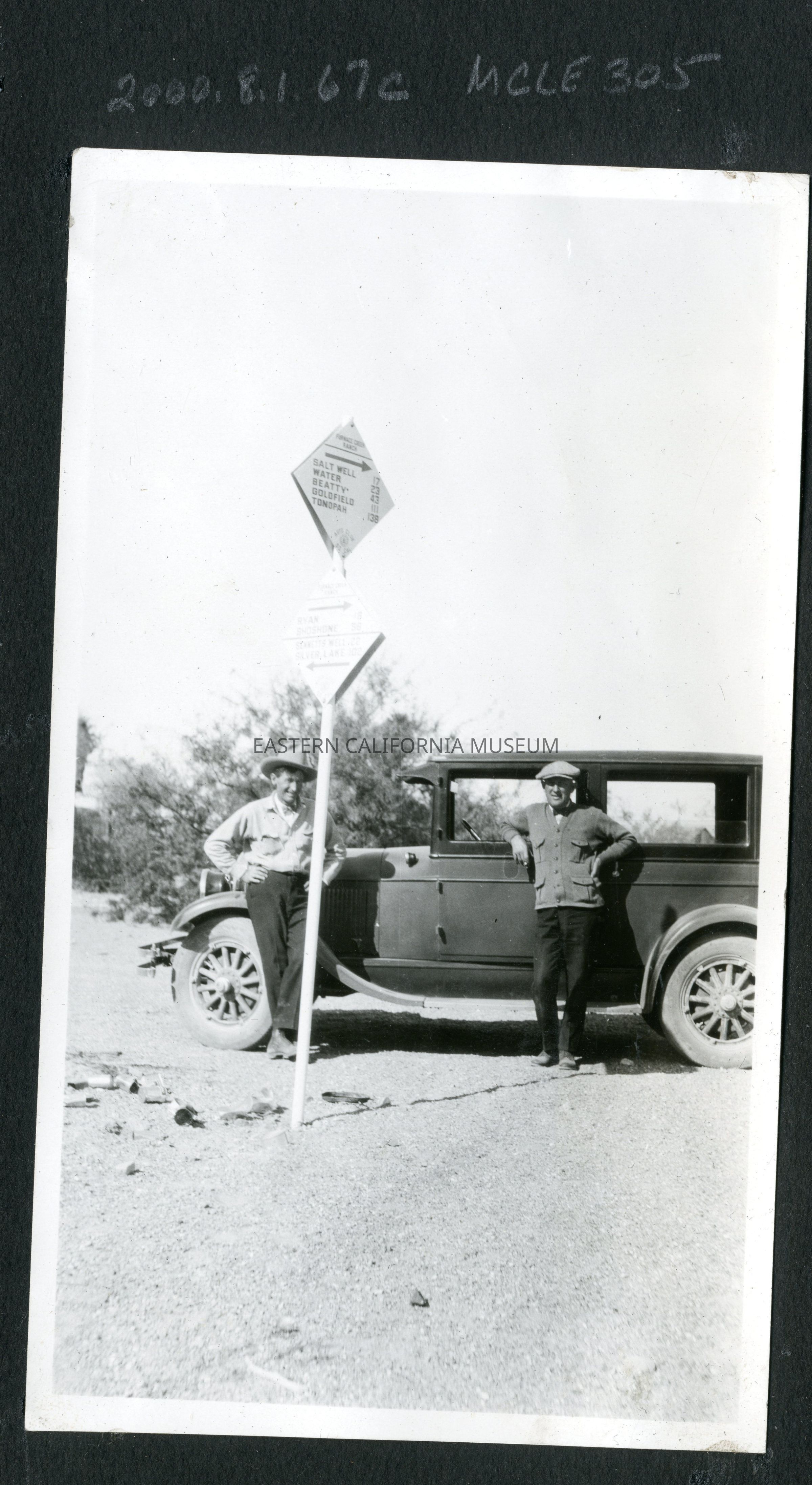 Two men are standing in front of an automobile (car/vehicle). Behind them are medium-height trees and possibly a structure behind the trees. In front of them is a directional road sign, "[Illegible] Salt Well / Water / Beatty / Goldfield / Tonopah" with an arrow pointing behind them. An illegible road sign with arrows pointing to their left and right is beneath.