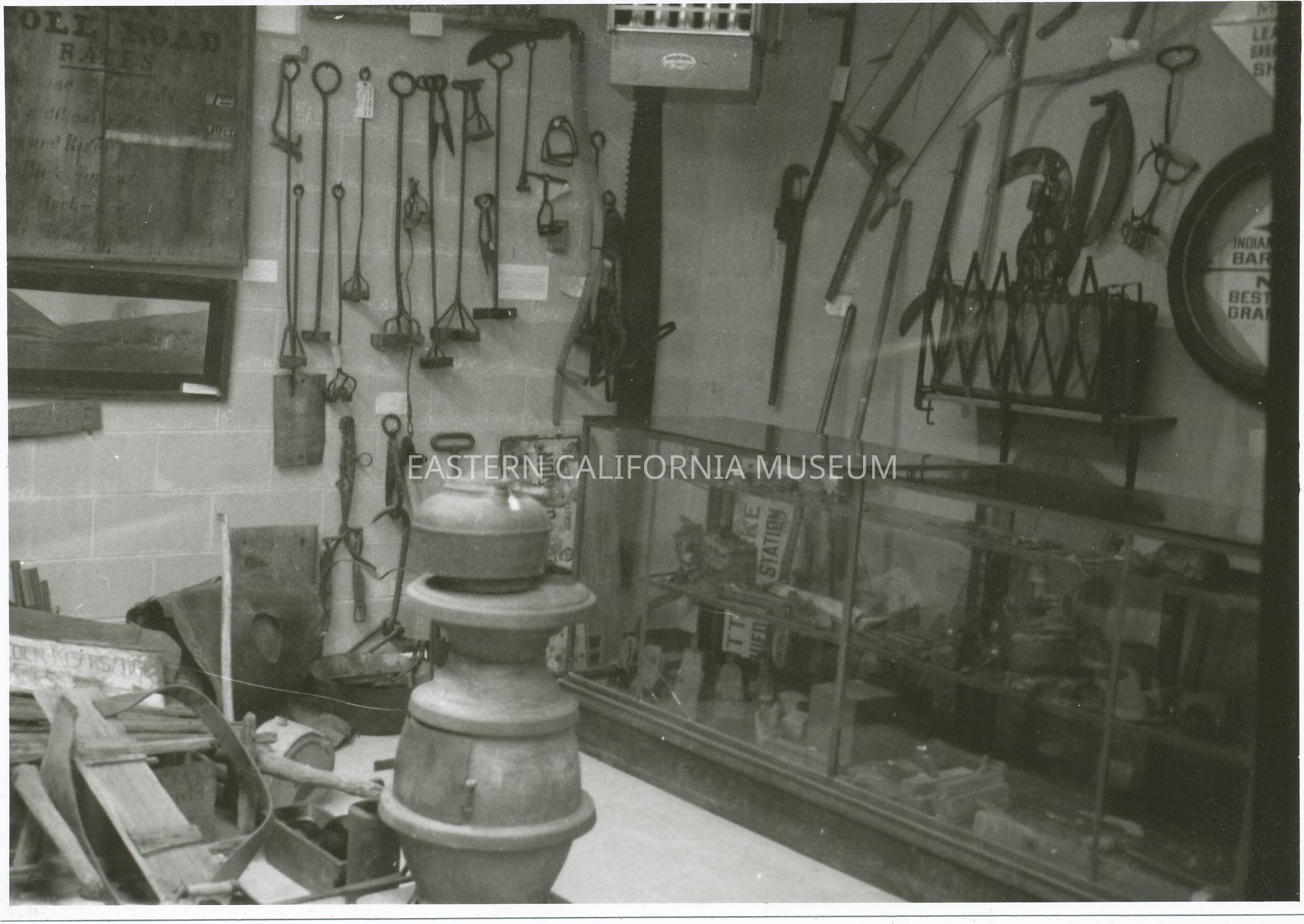 Interior photo of the Eastern California Museum in its Grant Street location (1968 or later). In foreground is potbelly stove with a kettle on the it. Hanging on the back wall are numerous branding irons, a saw, and a scythe. In the upper left corner is the Deep Springs Valley toll road sign (A506.1) and below the sign is the photo of the toll house (A2033Z.1). On the right side of image is a two shelf glass display case. Behind the case is one of the Little Lake Aqueduct Station signs (either 1972.141.1 or 1972.141.2), and above it on the extreme right are two diamond-shaped road signs.Photograph Details