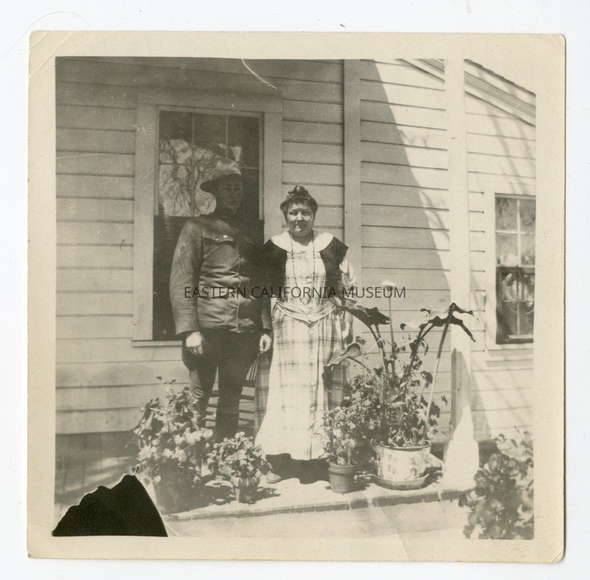Photo of a young man in military uniform (WWI?) and a woman standing on a wooden porch. There are lots of potted plants around their feet. They are identified as Grover and Amelia Anton.Collection