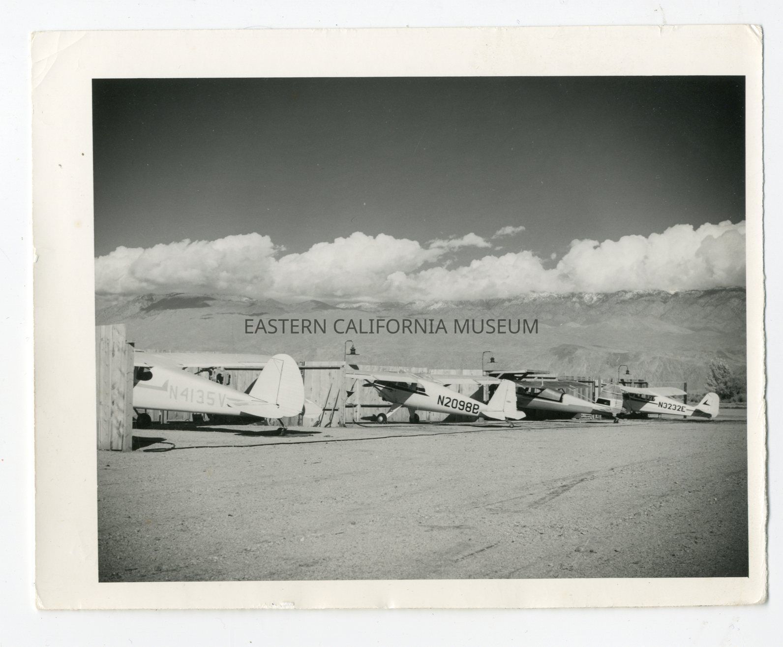 Photo of a row of four airplanes lined up with the Inyo mountain range in the background.