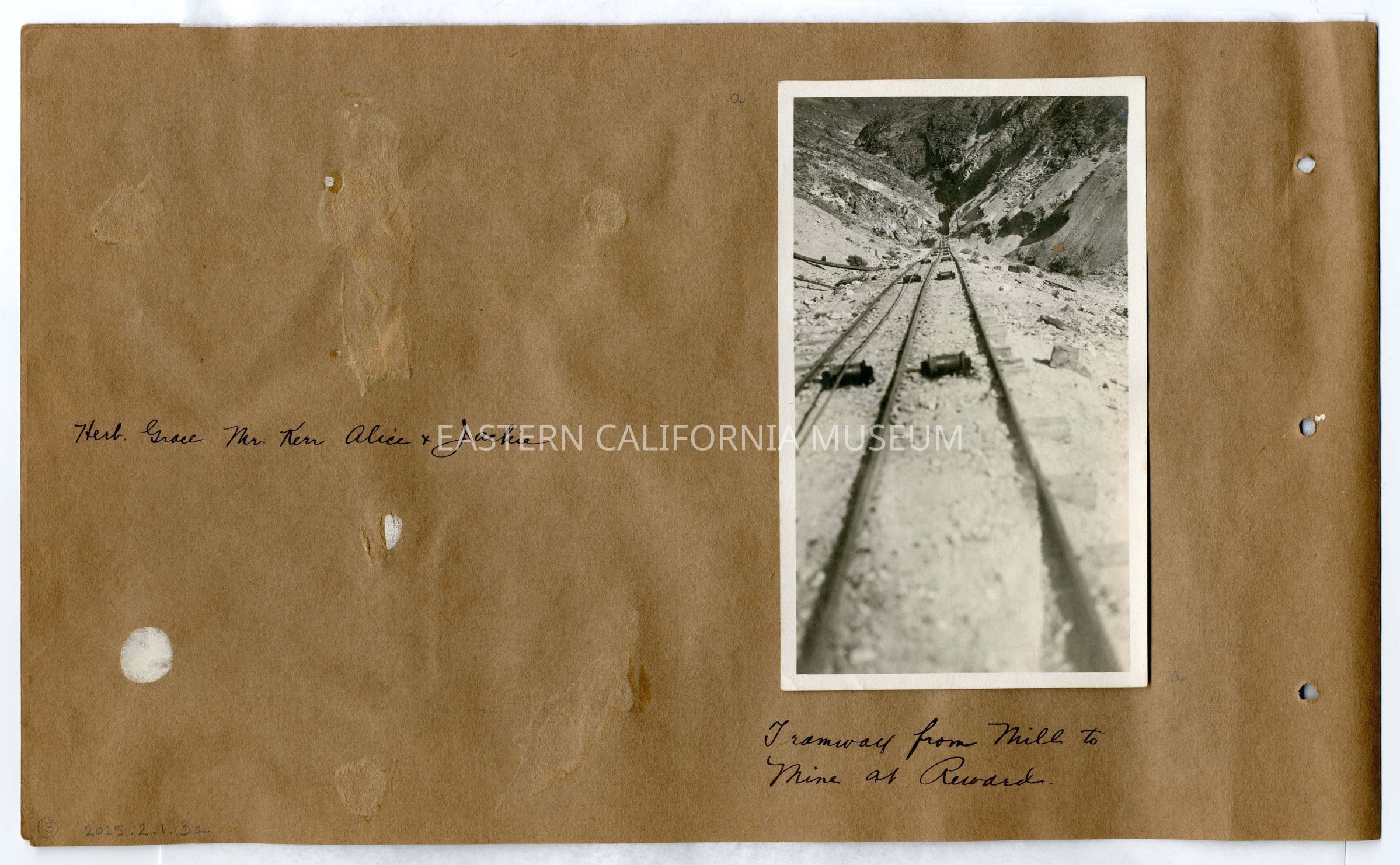 2025.2.1.3a--Tramway from mill to mine at Reward. Missing photo on this page was labeled "Herb, Grace, Mr. Kerr, Alice, and Jackie."
