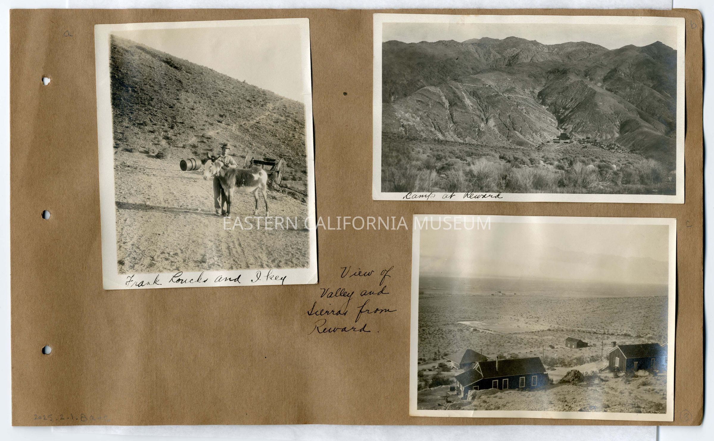 2025.2.1.8a--Frank Loucks and Ikey (a burro). 2025.2.1.8b--Camp at Reward. 2025.2.1.8c--View of Valley and Sierras from Reward.