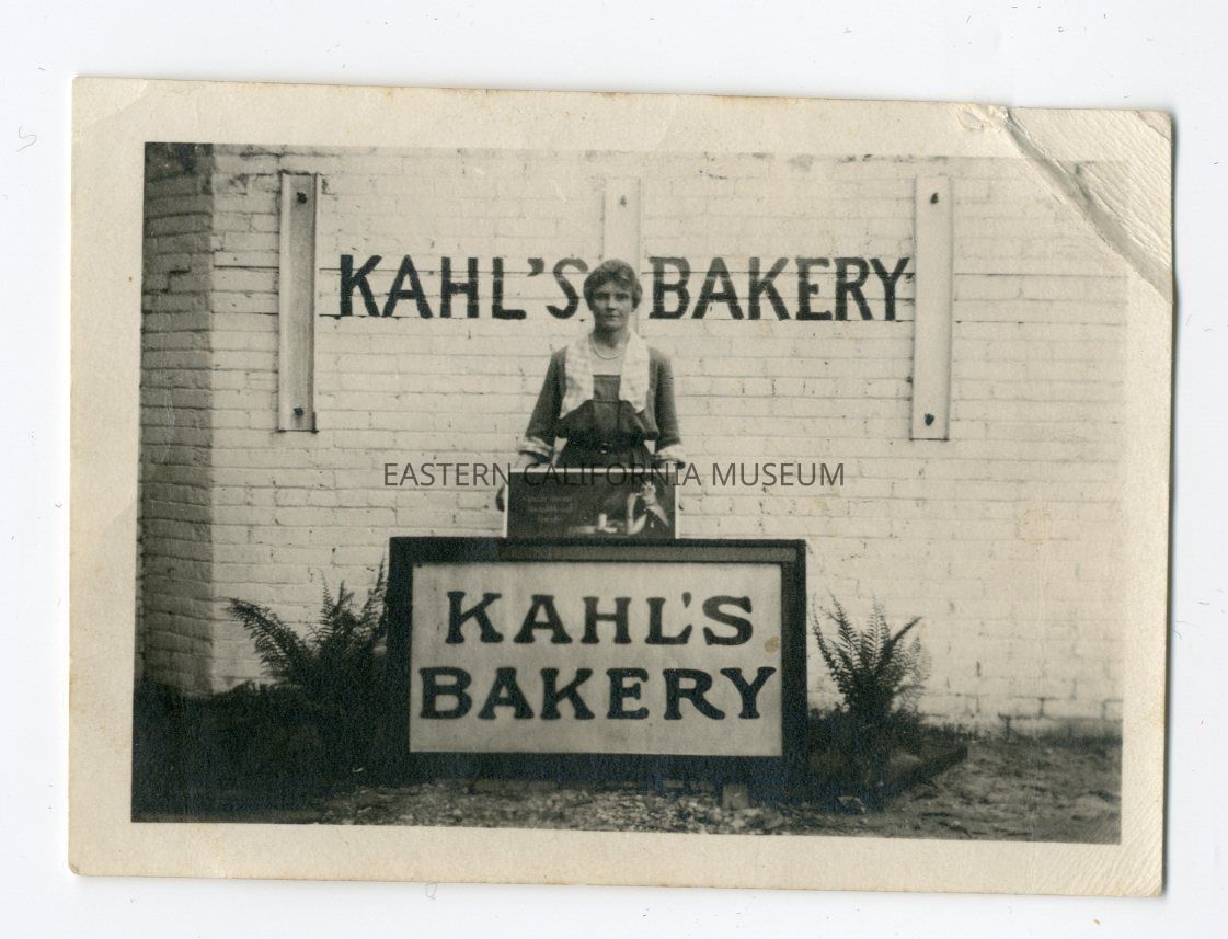 Photo of a woman standing in next to signs advertising Kahl's Bakery.