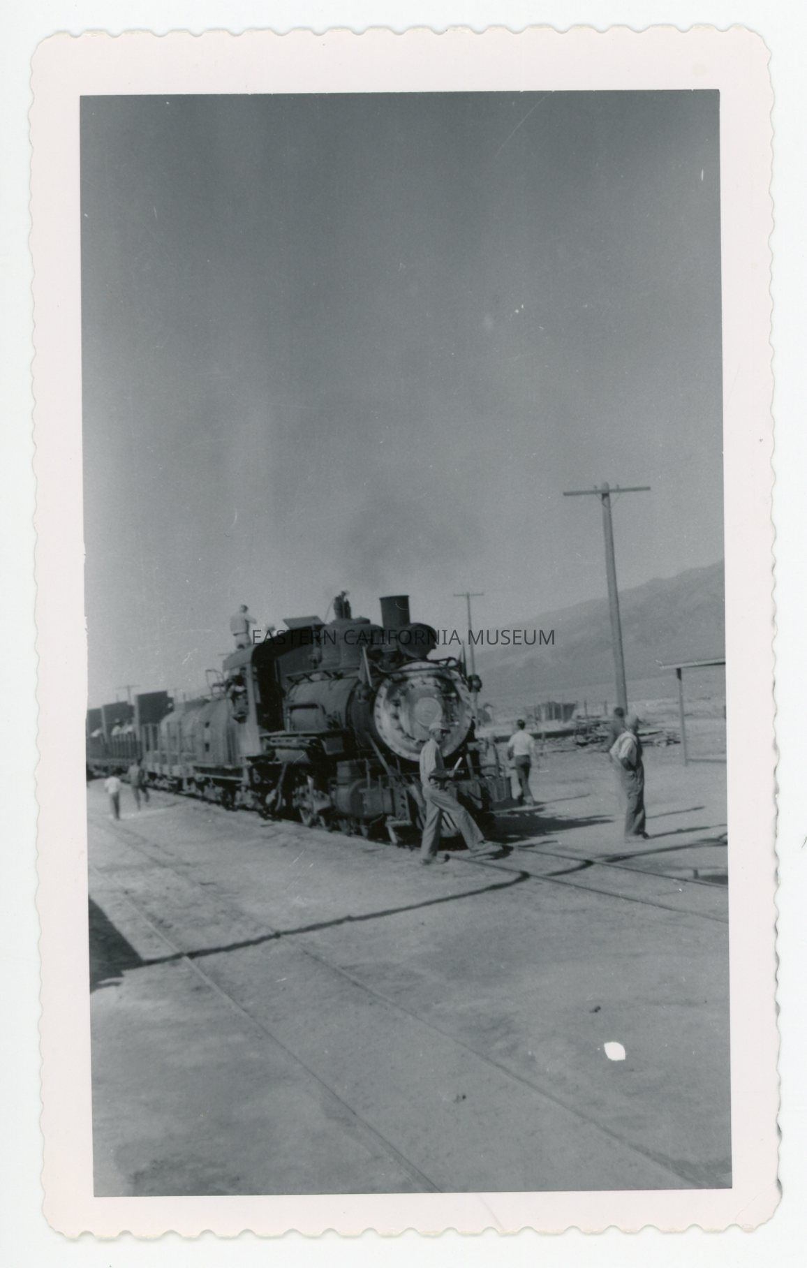 Photo of locomotive #8 with at least seven men walking around it.
