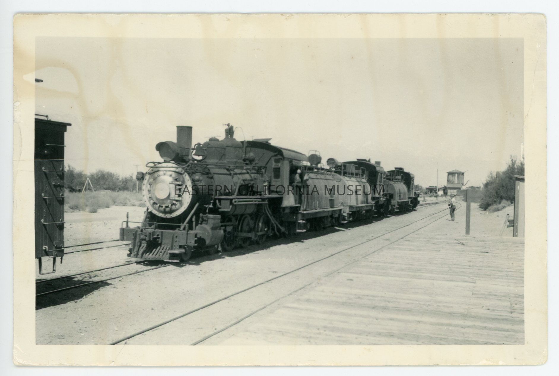 Photo of locomotive #8 with a water tank in the background. There is a wooden platform in the foreground. Someone has identified the location as Keeler.Collection
