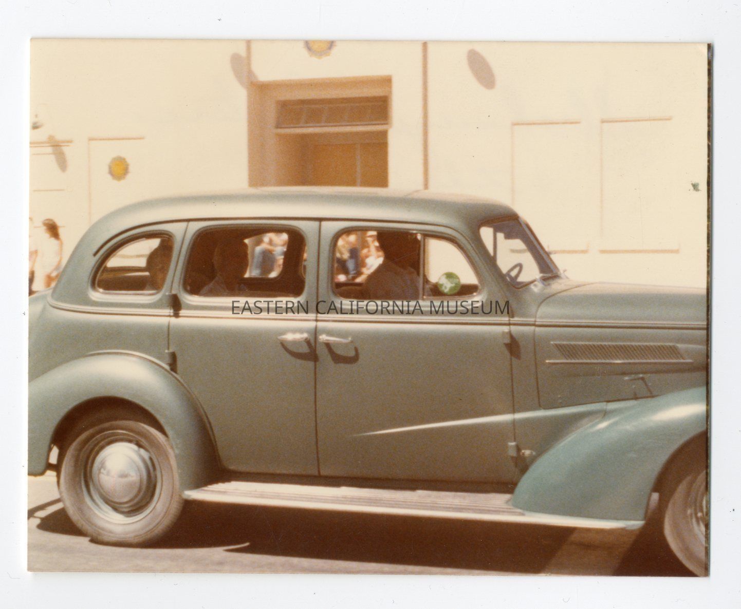 Color photo of two women sitting in the back of an early automobile as it passes the American Legion Hall in Independence during the 4th of July parade in 1979.