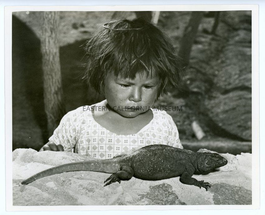 Photo of a young girl (Native American?) looking at a chuckwalla. Handwritten in pencil on reverse: Death Valley c. 1930.