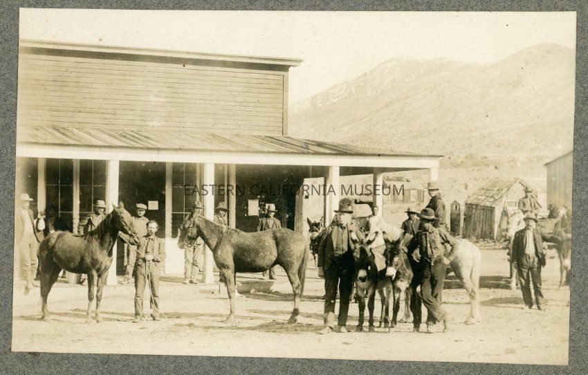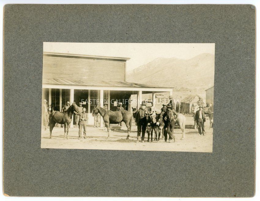 Mounted photo of a group of men, mules, and horses in front of a building in the town of Darwin, 1909.