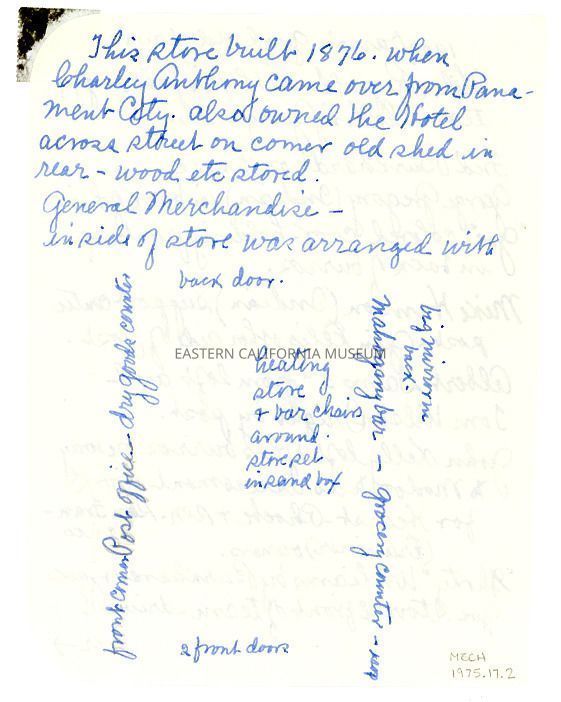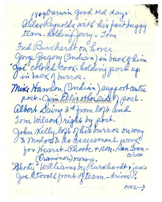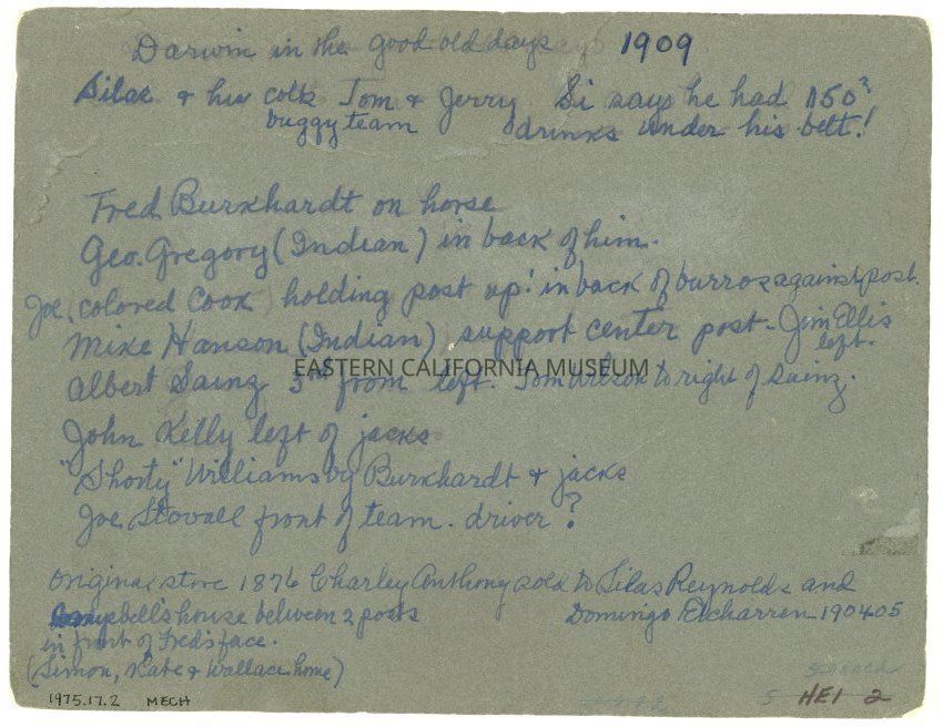Handwritten on a sheet of paper taped to reverse: 1909 Darwin good old days. Silas Reynolds with his fast buggy team holding Jerry [and] Tom. Fred Burkhardt on horse. George Gregory (Indian) in back of him. "Joe" colored cook holding post up in back of burros. Mike Hanson (Indian) support center post. Jim Ellis other side of post. Albert Sainz 3rd from left and Tom Wilson right by post. John Kelly left of his burros on way to Modoc to do assessment work for Hearst-Phoebe and son [William Randolph Hearst], San Francisco Examiner owners. "Shorty" Williams by Burkhardt and Jacks. Joe Stovall front of team, driver? This store built 1876 when Charley Anthony came over from Panamint City. Also owned the hotel across street on corner. Old shed in rear--wood etc. stored. General Merchandise inside of store was arranged with [diagram includes] front corner post office--dry goods counter--back door--big mirror in back--mahogany bar--grocery counter--[illegible]--2 front doors--[in center] heating stove and bar chairs around stove set in sand box.Collection