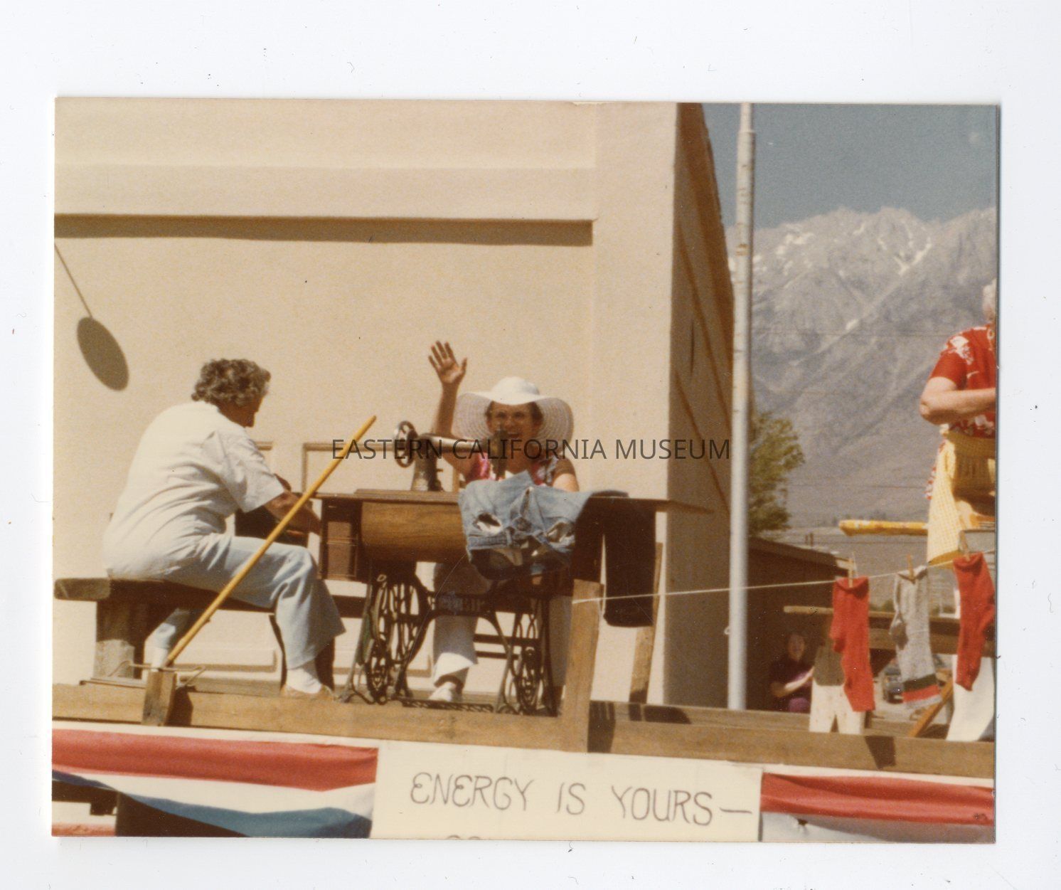 Color photo of a woman sitting at a treadle sewing machine on a float going past the American Legion Hall in Independence during the 1979 4th of July parade. There is bunting and a sign that says, "Energy is yours."