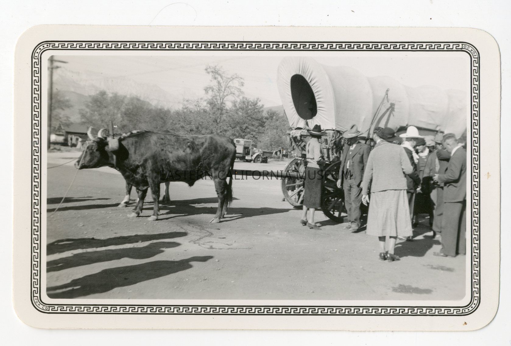 Photo of two oxen pulling a covered wagon. There is a crowd of people standing on the right side. Likely taken during the Wedding of the Waters celebration.