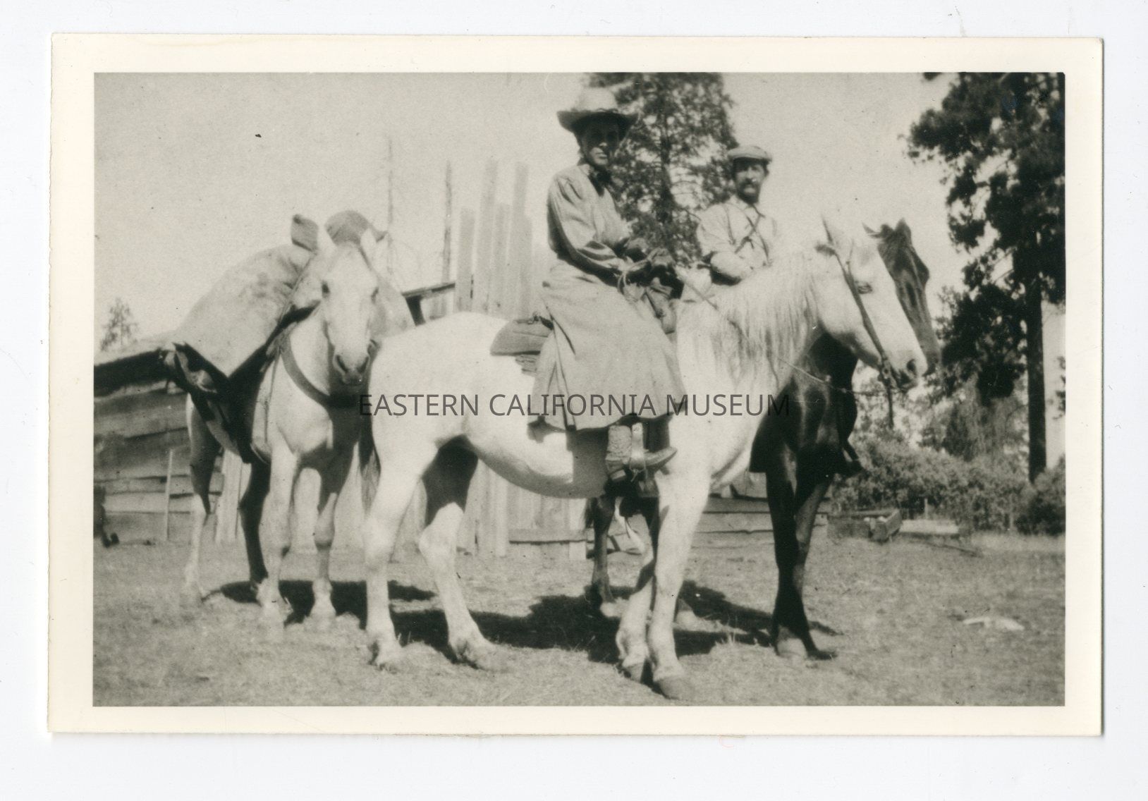 Photo of two people (a woman and a man) on horseback with a third horse or pack mule loaded with equipment. There is a wooden structure in the background.