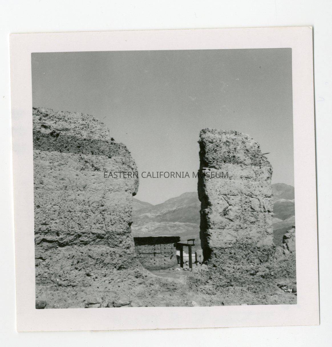 Square photo of the remains of what might be an adobe wall with a big hole in the center (doorway?). Written on reverse: Mine Trails.