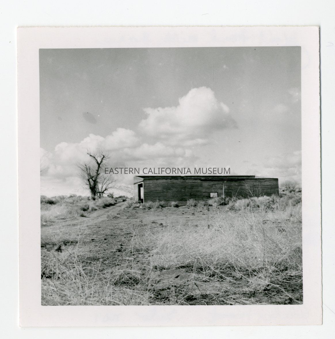 Photo of a long, low wooden structure. Looks abandoned with a dead tree to the left of it. Written on reverse: Wint Ford milk barn. Silo no. 1.