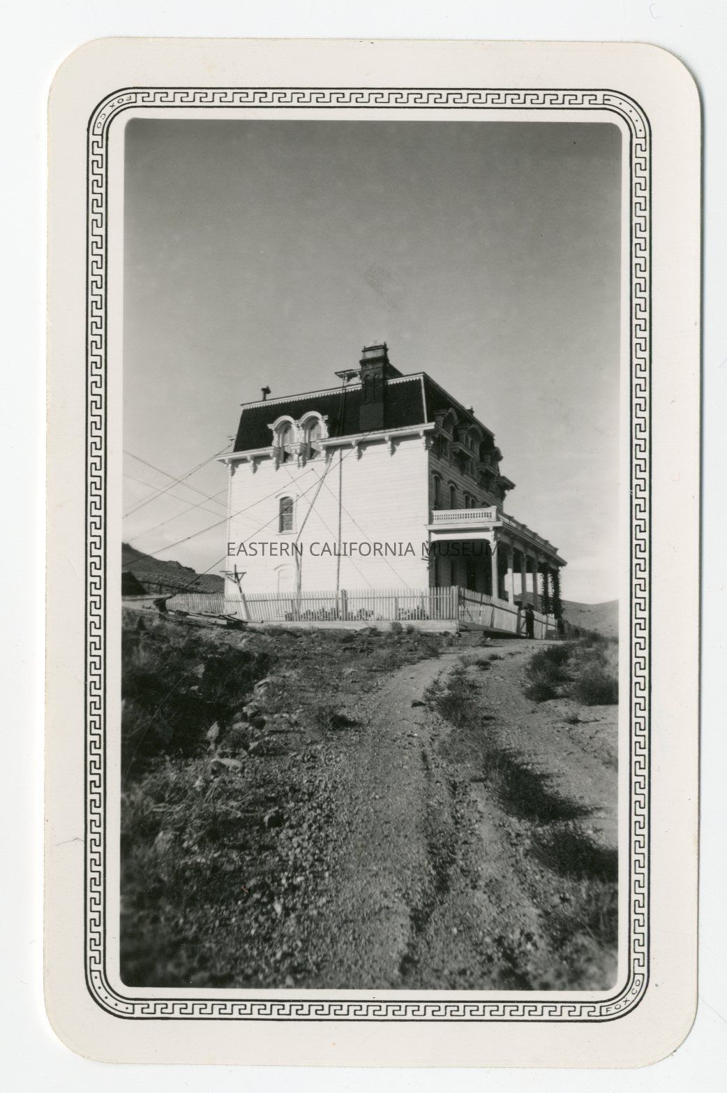 Photo of a multi-story white house with arched windows and a covered patio or veranda.