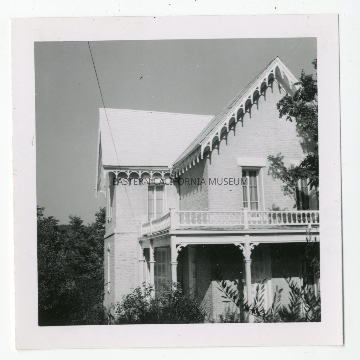 Photo of a two story house with ornate roofline. Written in pencil on reverse: San Andreas.