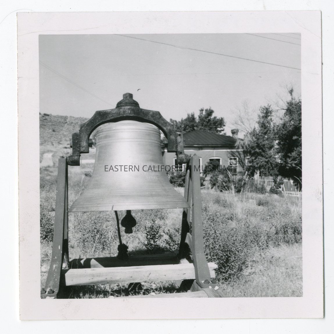 Photo of a bell with a house in the background. Written on reverse: Cover photo.