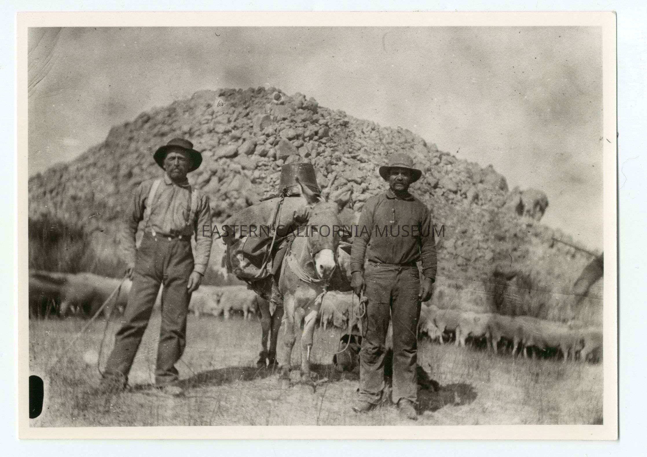 Photo of two men with one laden pack mule and a flock of sheep in the background. Written on reverse: Livestock Trails. A.G. [Alfred Giraud].