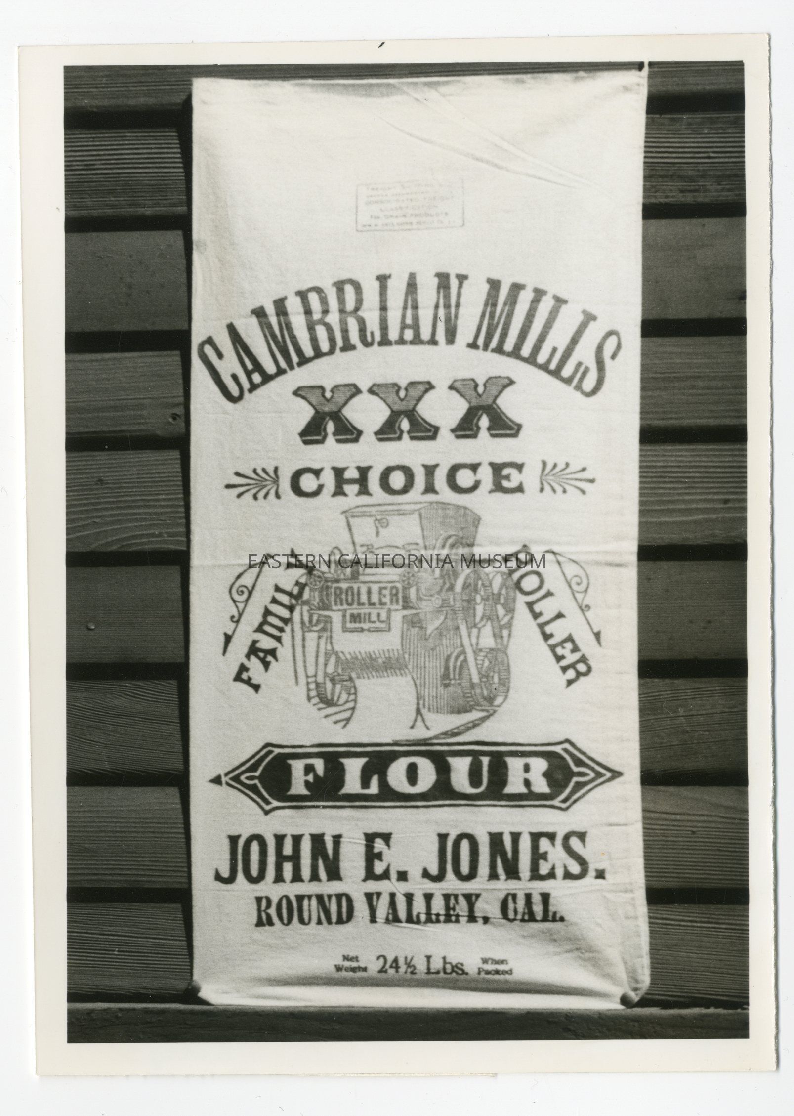 Photo of a flour sack. It says, "Cambrian Mills XXX Choice Family Roller FLour, John E. Jones, Round Valley, Cal. Net weight 24 /12 lbs. when packed."