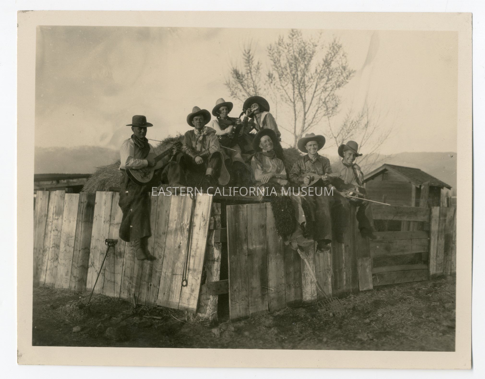 Photo of a group of cowboys and cowgirls sitting on a wooden fence and haystay with instruments.