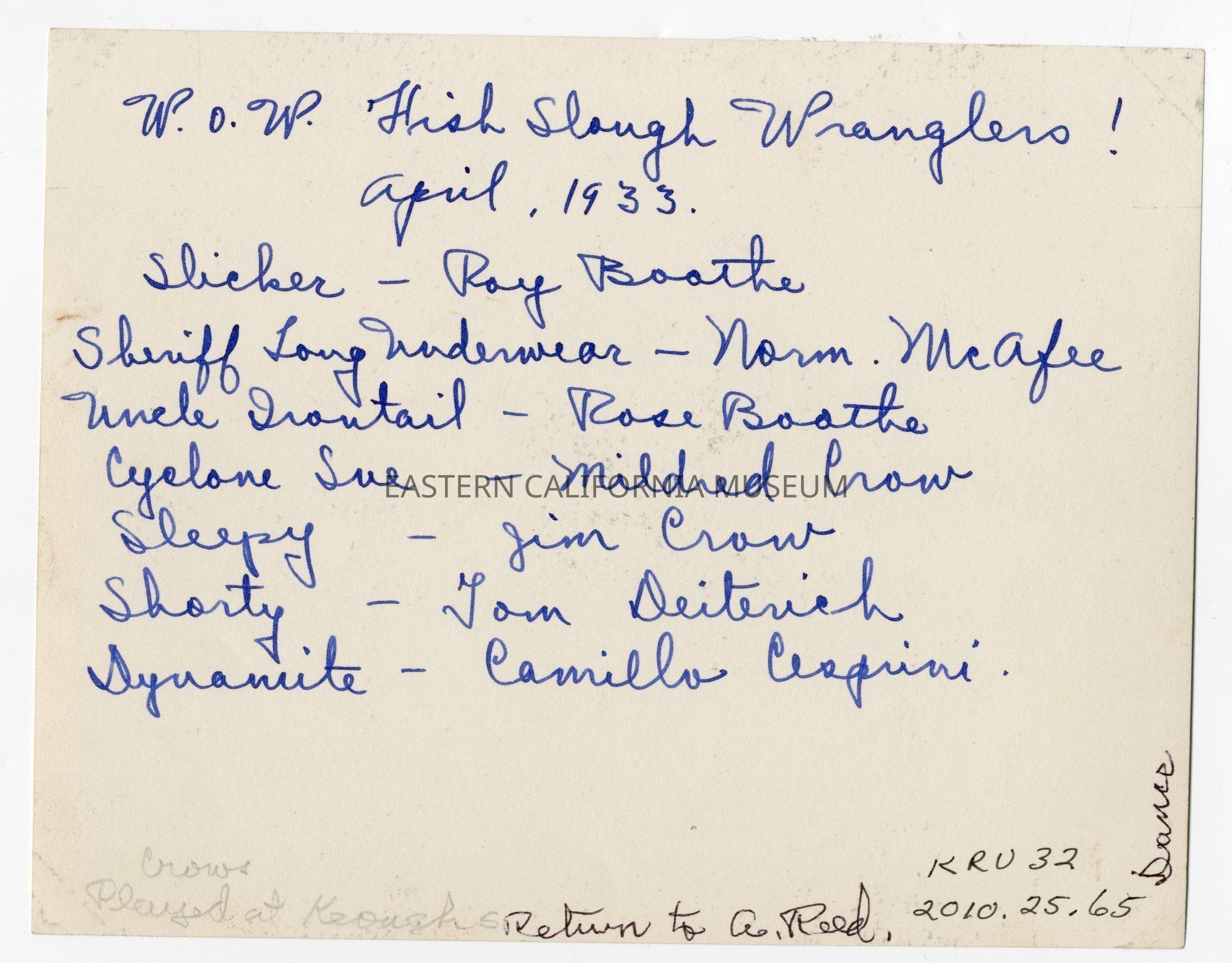 Written in ink on reverse: W.W. Fish Slough Wranglers, April 1933. Slicker--Roy Boothe, Sheriff Long Underwear--Norm McAfee, Uncle Irontail--Rose Boothe, Cyclone Sue--Mildred Crow, Sleepy--Jim Crow, Shorty--Tom Dieterich, Dynamite--Camillo Cesprini (sp?). Dance.